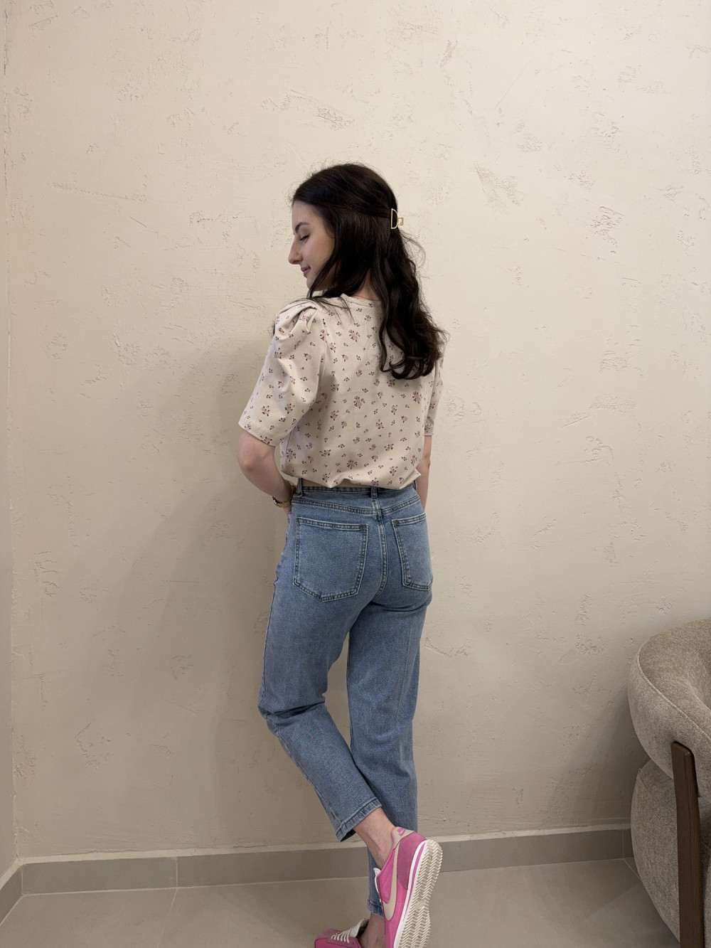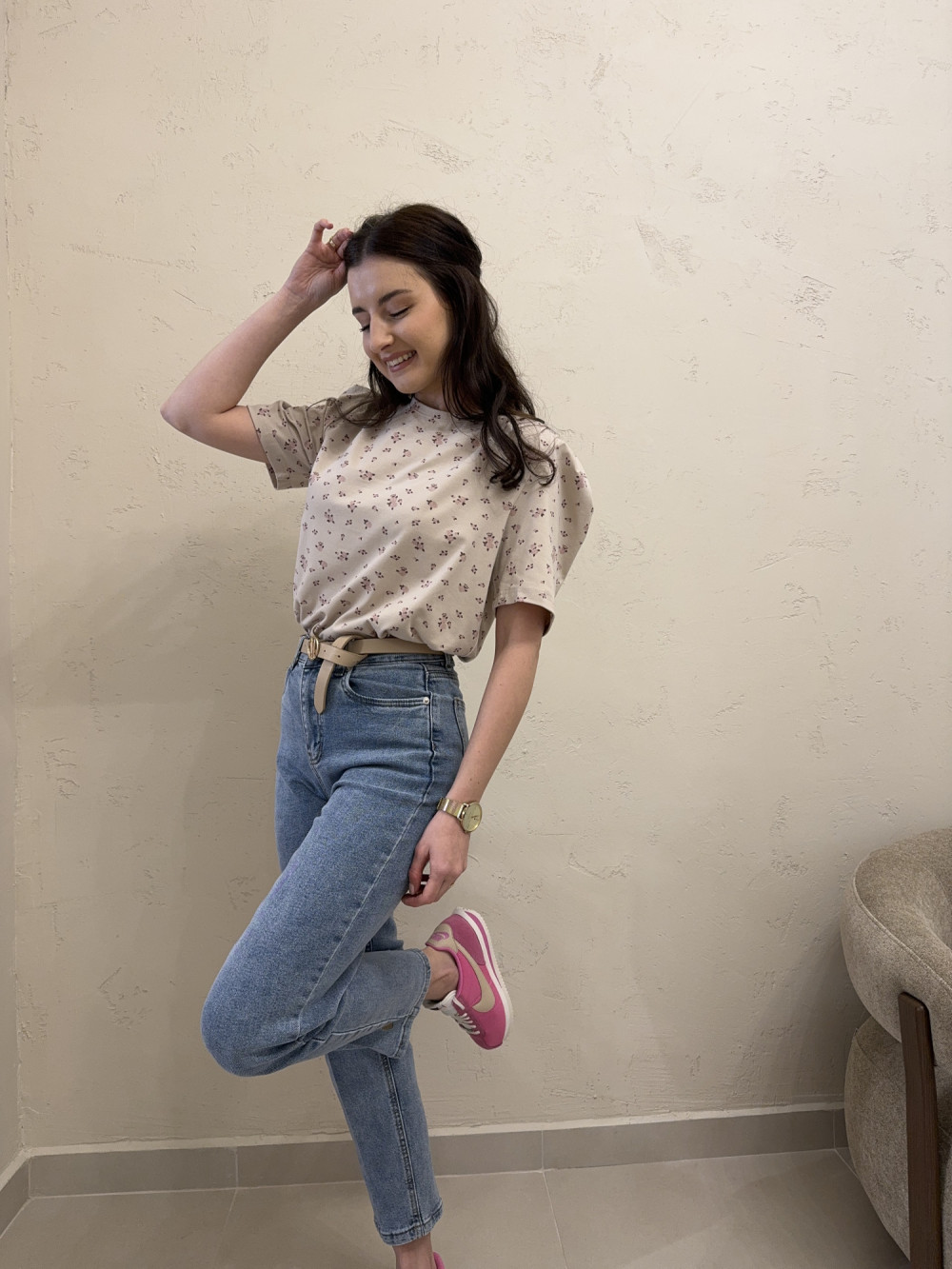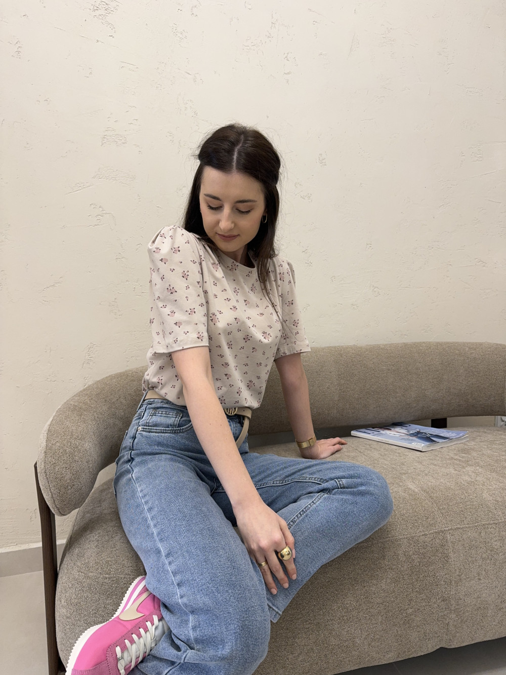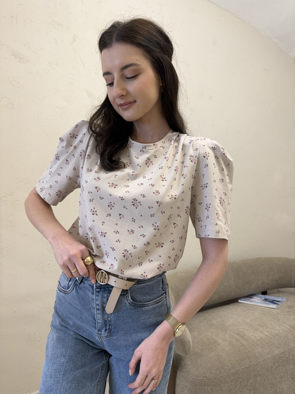 T-shirt z poduszkami na ramionach w kwiaty beżowy ROSIE