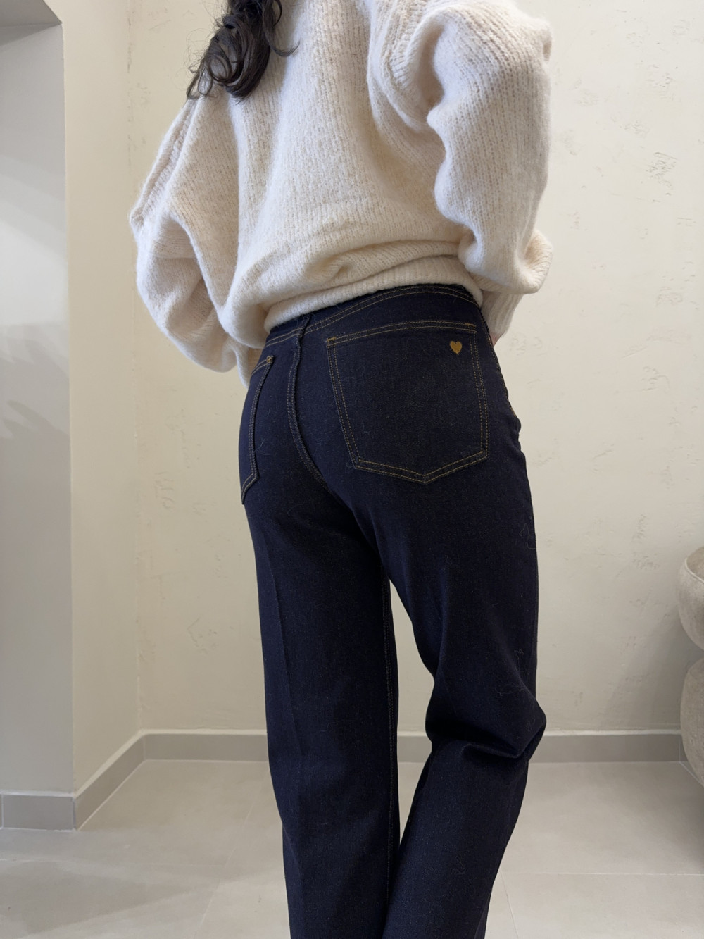 Ciemnogranatowe dżinsy z wysokim stanem, uszyte z miękkiego materiału z przewagą bawełny. Model wyróżnia subtelny kant biegnący wzdłuż nogawki, który optycznie ją wydłuża. Na pupie znajduje się haftowane serduszko, dodające całości uroczego akcentu. Idealne połączenie klasycznej formy z dziewczęcym detalem.