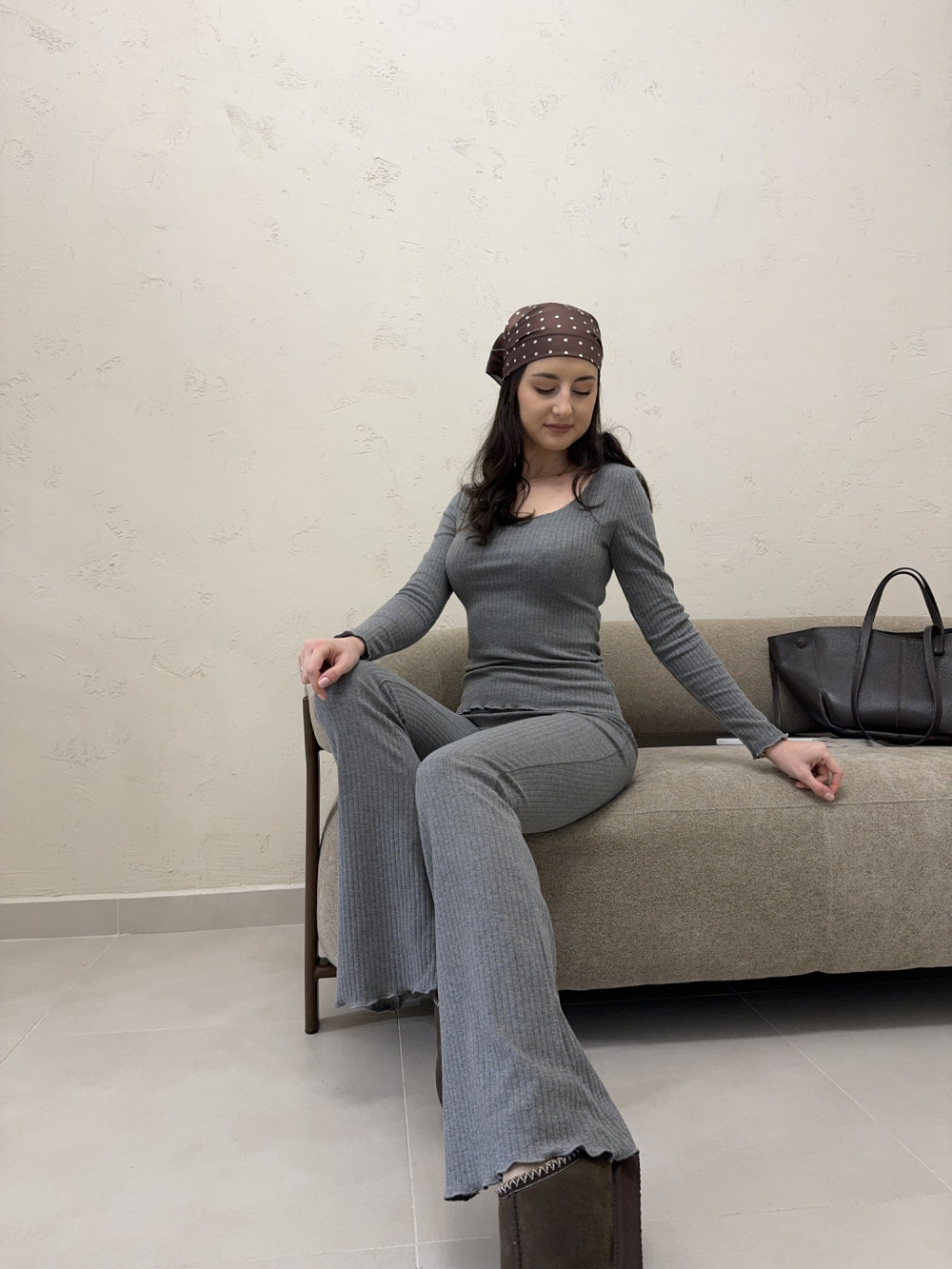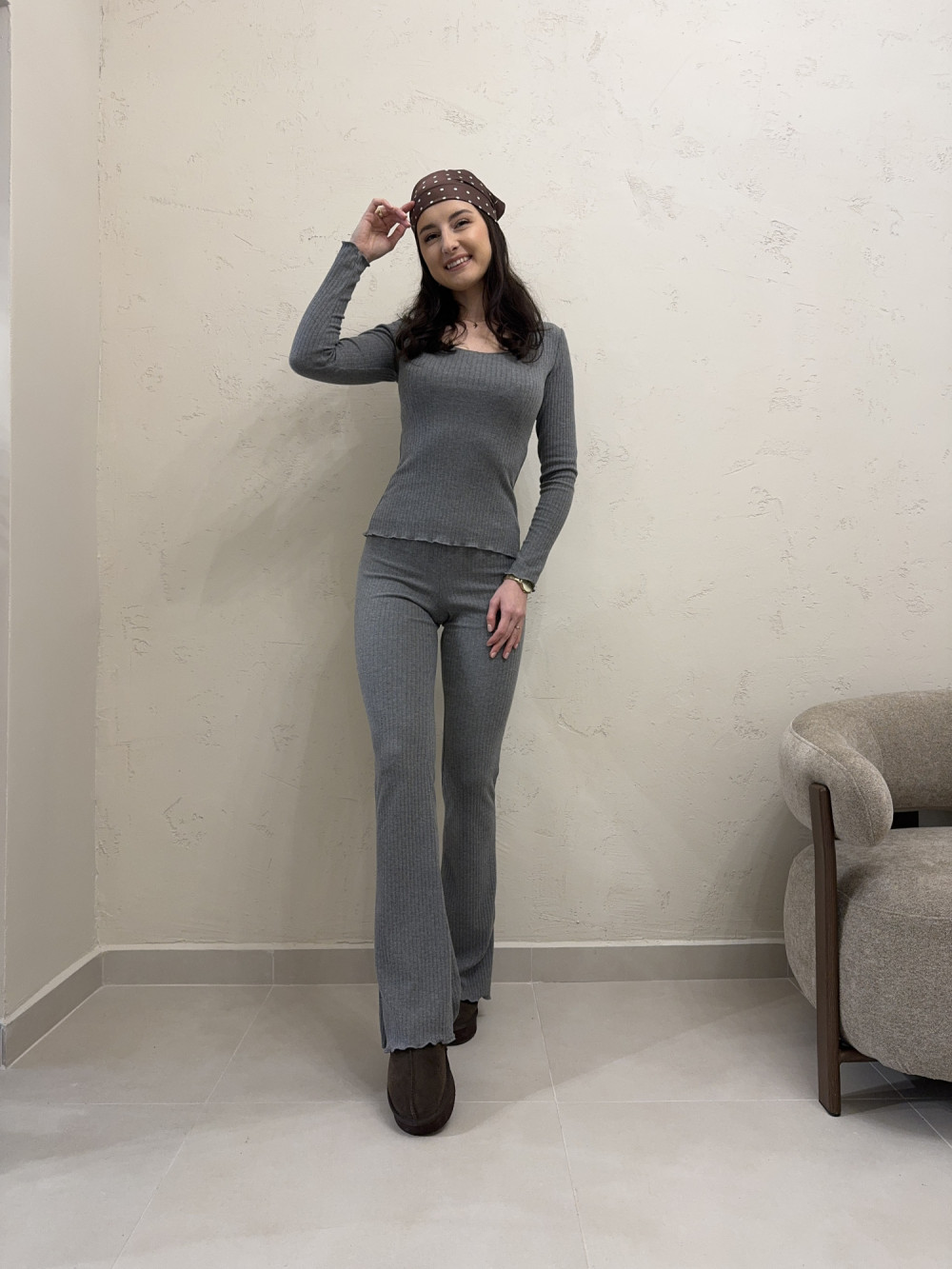 Legginsy dzwony prążek z mereżką szare MADISON