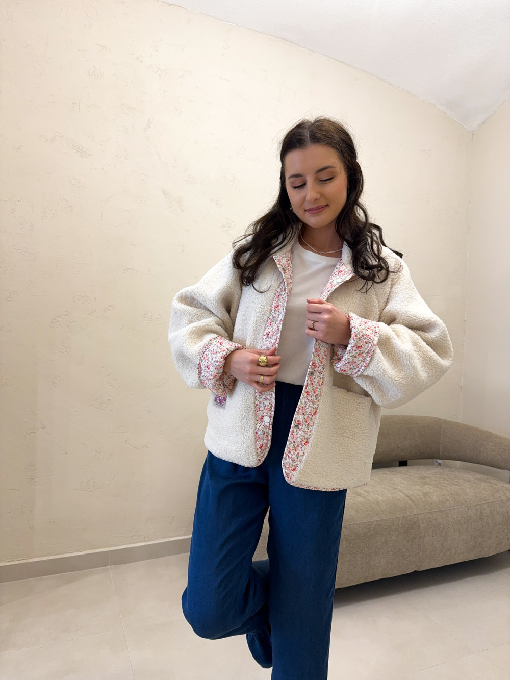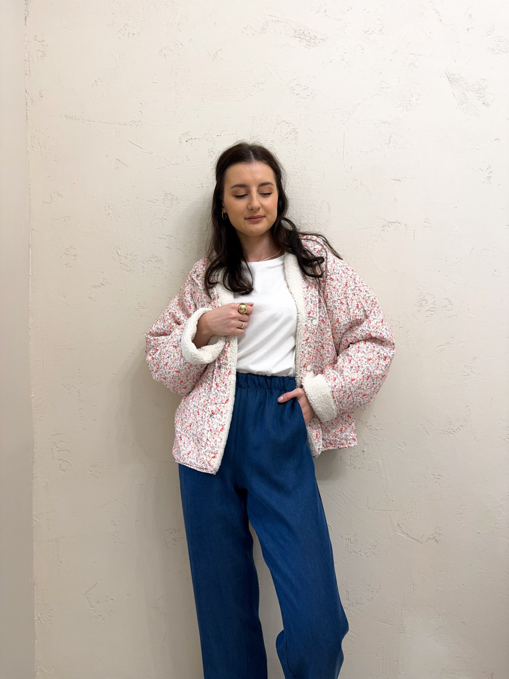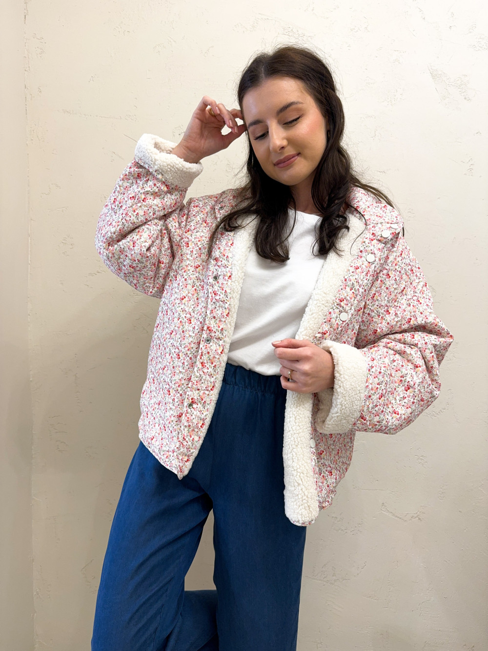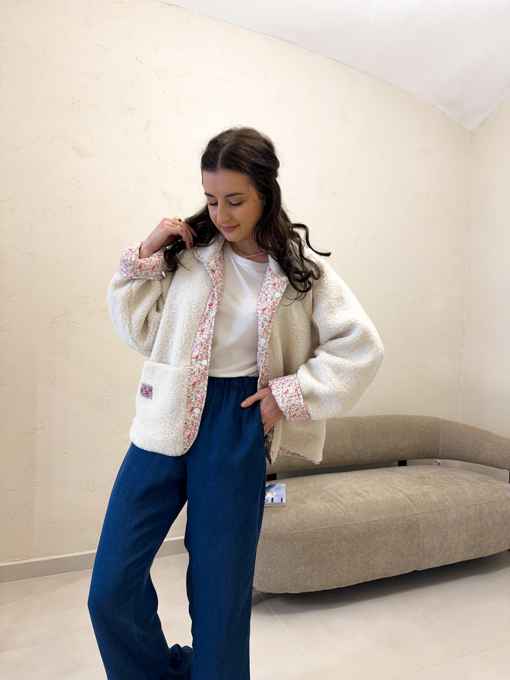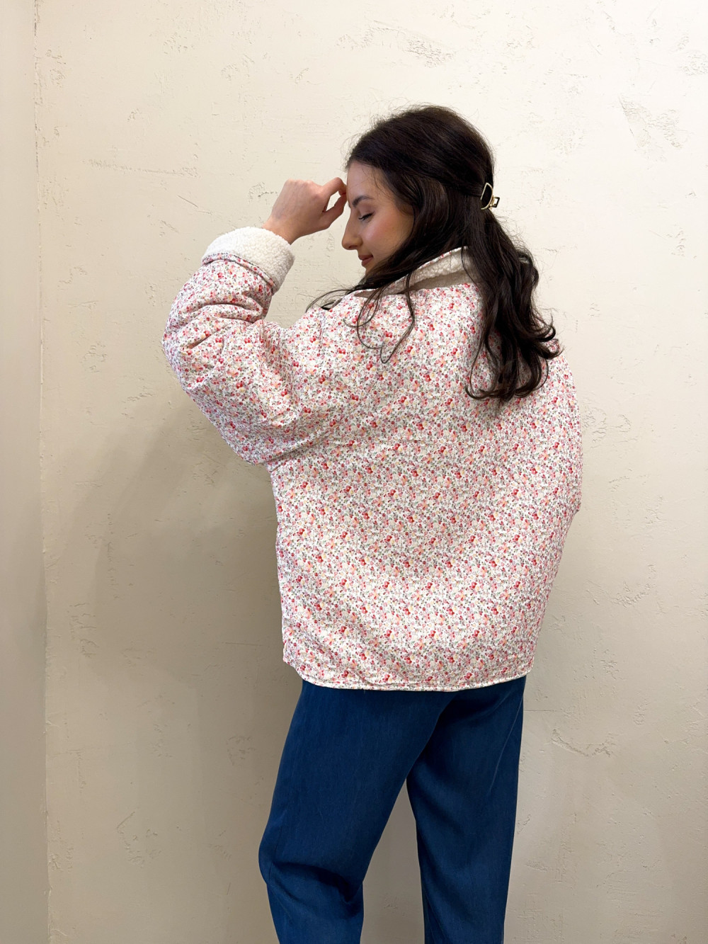 Miękki, dwustronny polar, który daje dwie stylizacje w jednym modelu — z jednej strony puszysty, jednolity materiał, z drugiej delikatny, kwiatowy wzór o romantycznym charakterze. Tkanina jest przyjemna w dotyku, ciepła, ale lekka, idealna na przejściowe pory roku. Model zapinany na wygodne zatrzaski, które dodają całości casualowego charakteru. Luźniejszy krój zapewnia swobodę ruchów, a praktyczne kieszenie podkreślają użytkowy styl. To idealna propozycja dla kobiet, które lubią funkcjonalność połączoną z subtelnym wzornictwem.