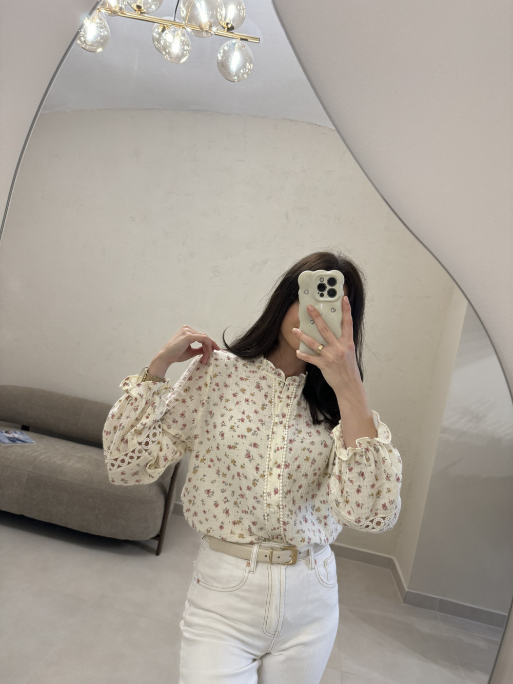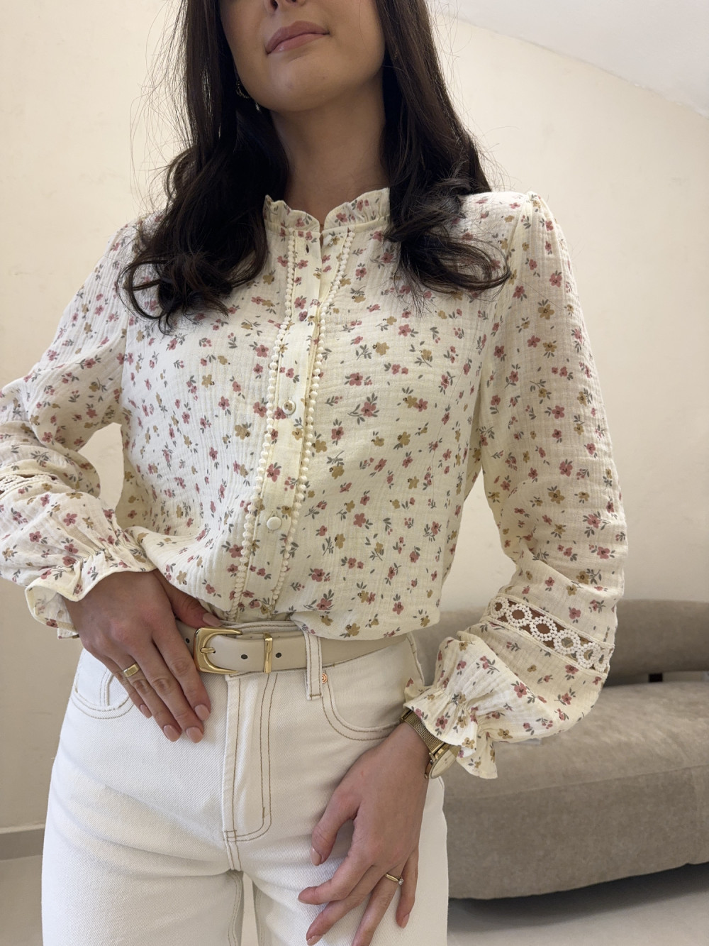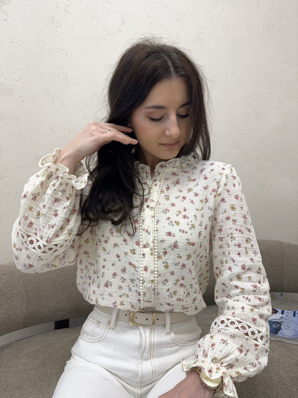 Koszula uszyta w 100% z bawełny, lekka i przyjemna w noszeniu. Drobny kwiatowy wzór nadaje jej delikatnego, romantycznego charakteru. Ozdobne guziki, subtelne wykończenia i faktura materiału sprawiają, że całość wygląda bardzo dopracowanie. Rękawy z delikatnym marszczeniem i koronkowe detale dodają jej uroku. To koszula, która pięknie wygląda zarówno solo, jak i pod swetrem.