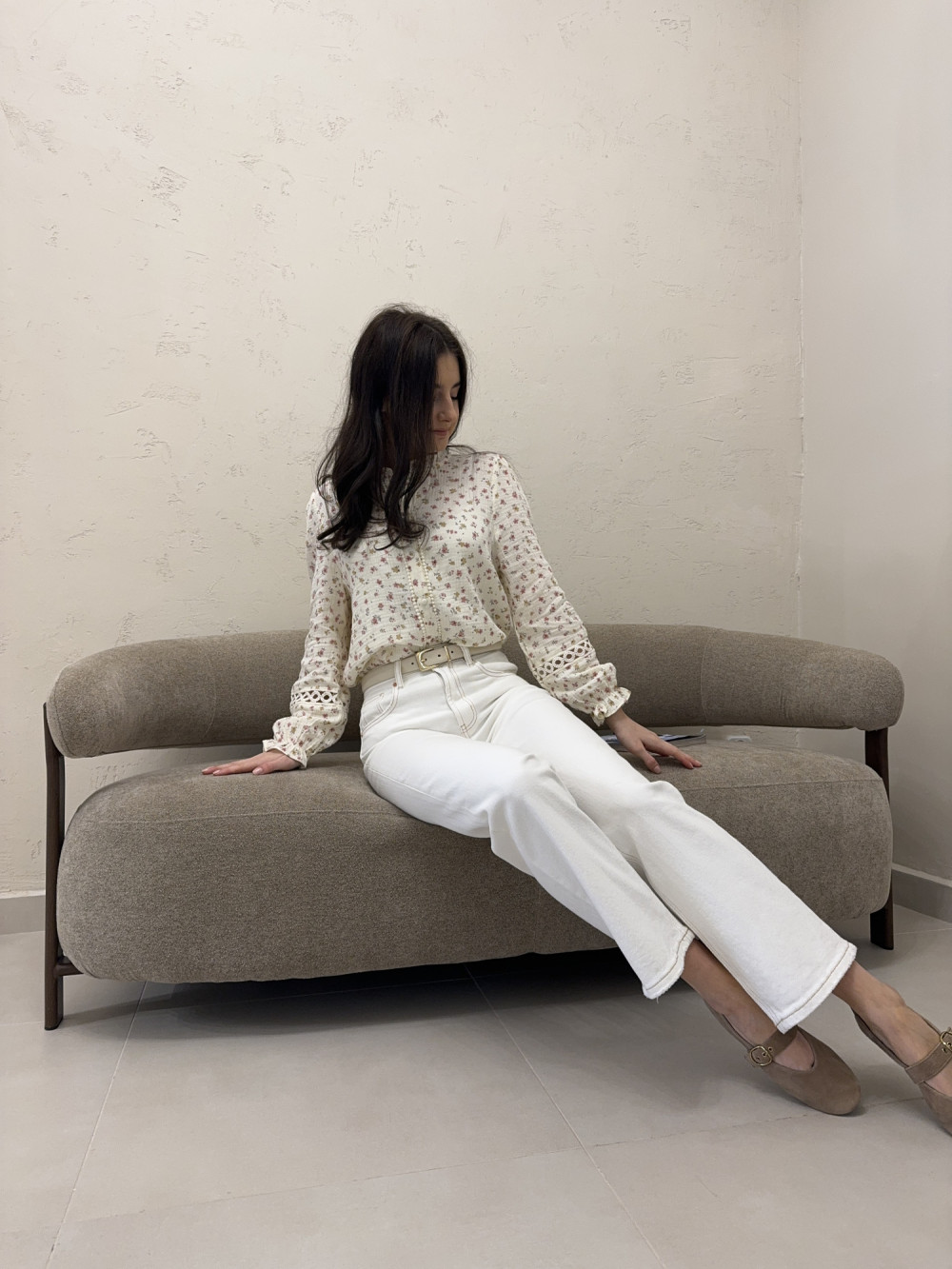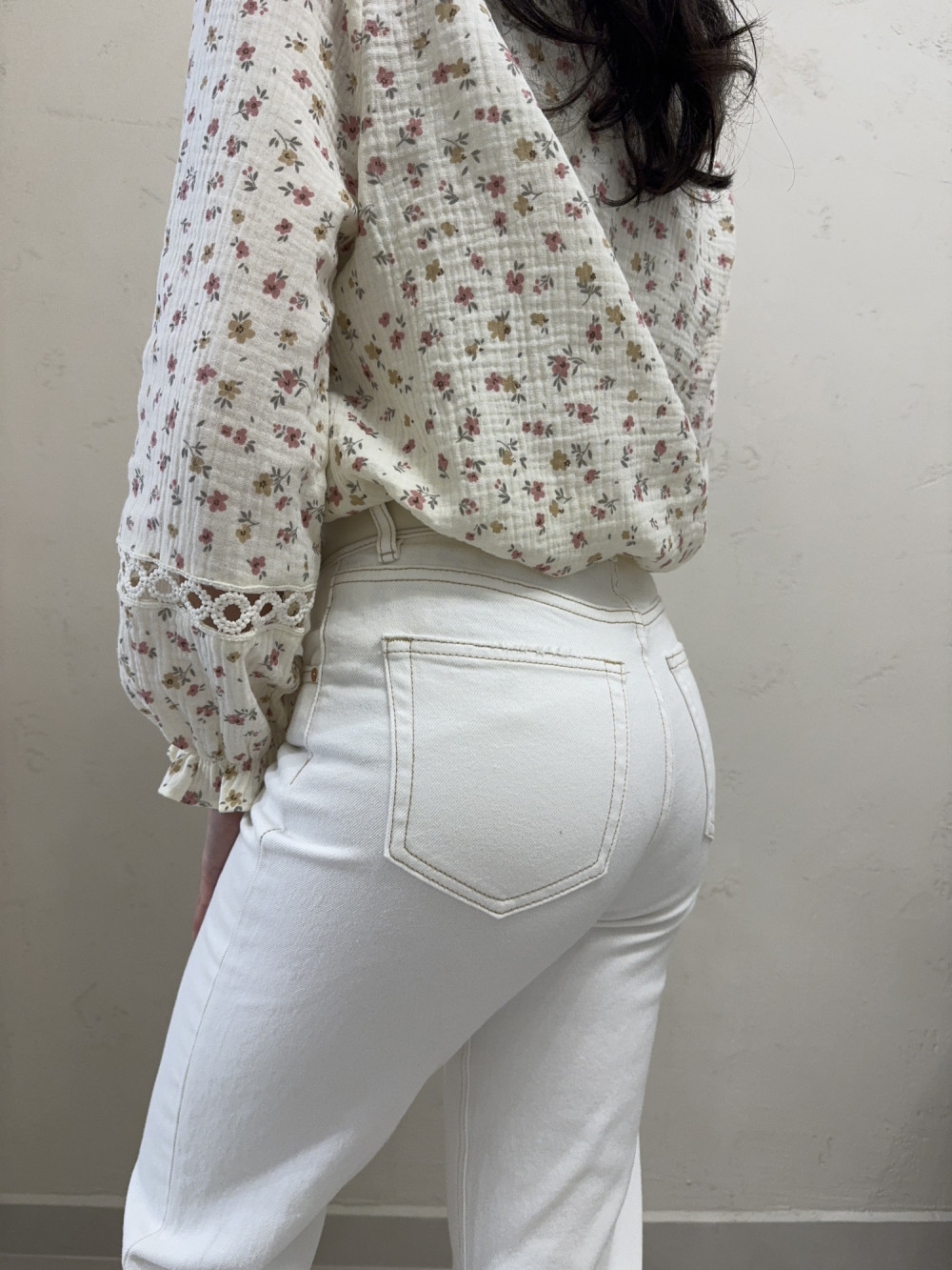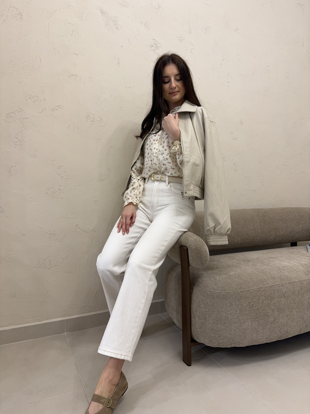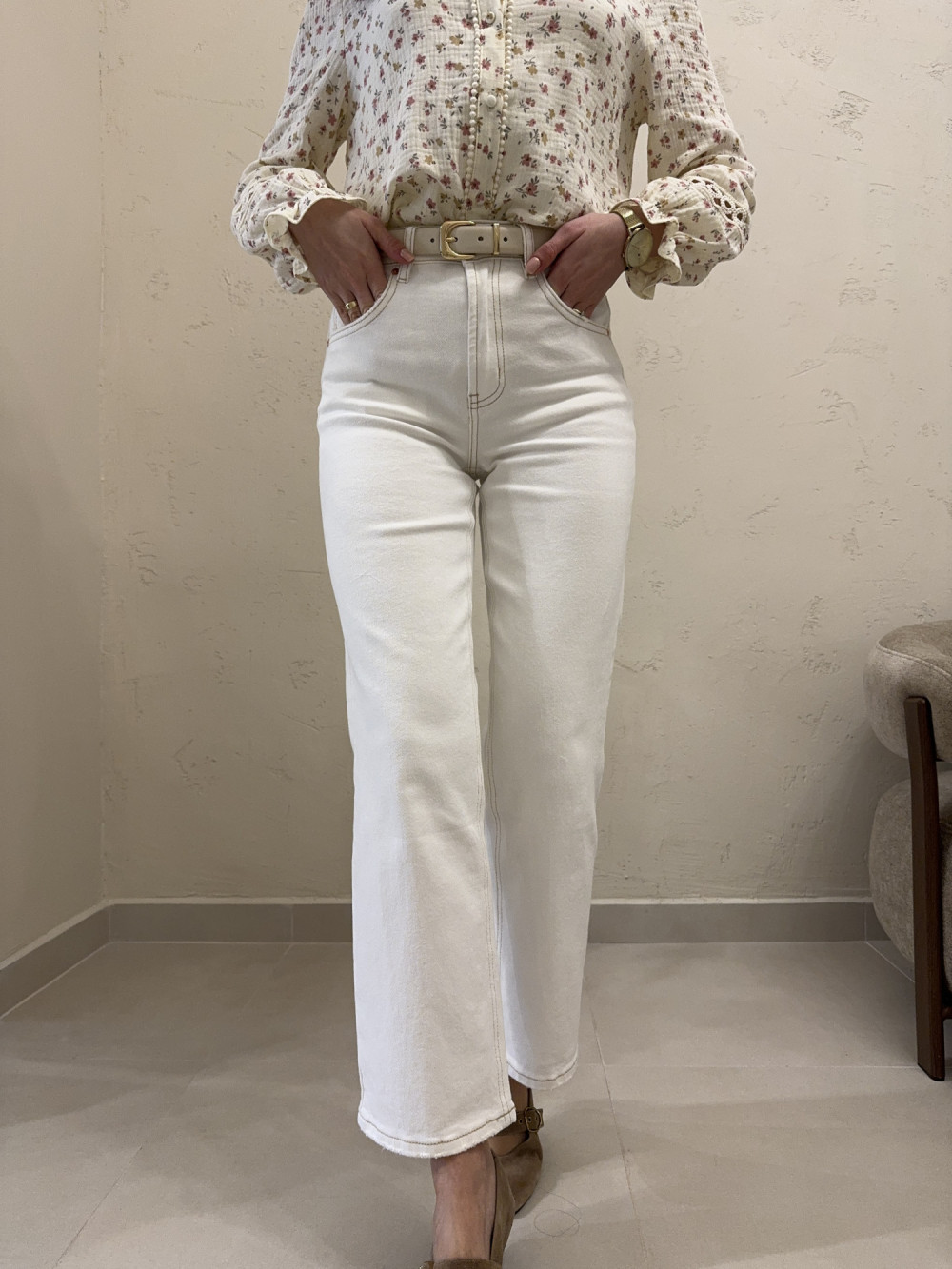 Jasne jeansy o prostych, lekko skróconych nogawkach, które pięknie eksponują kostki i wydłużają sylwetkę. Uszyte z miękkiego, przyjemnego w dotyku dżinsu, zapewniają wygodę przez cały dzień. Wysoki stan podkreśla talię, a kontrastowe przeszycia brązową nicią dodają im charakteru i wyrafinowanego wykończenia. To model, który łączy klasykę z nowoczesnym detalem. Idealne do codziennych stylizacji, ale też do bardziej eleganckich zestawów.