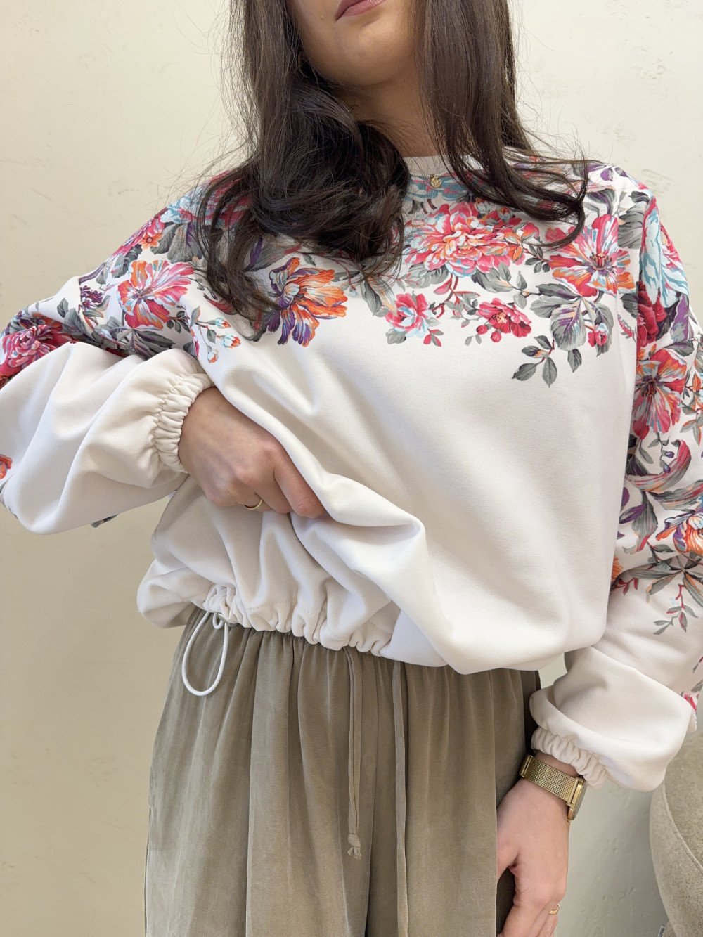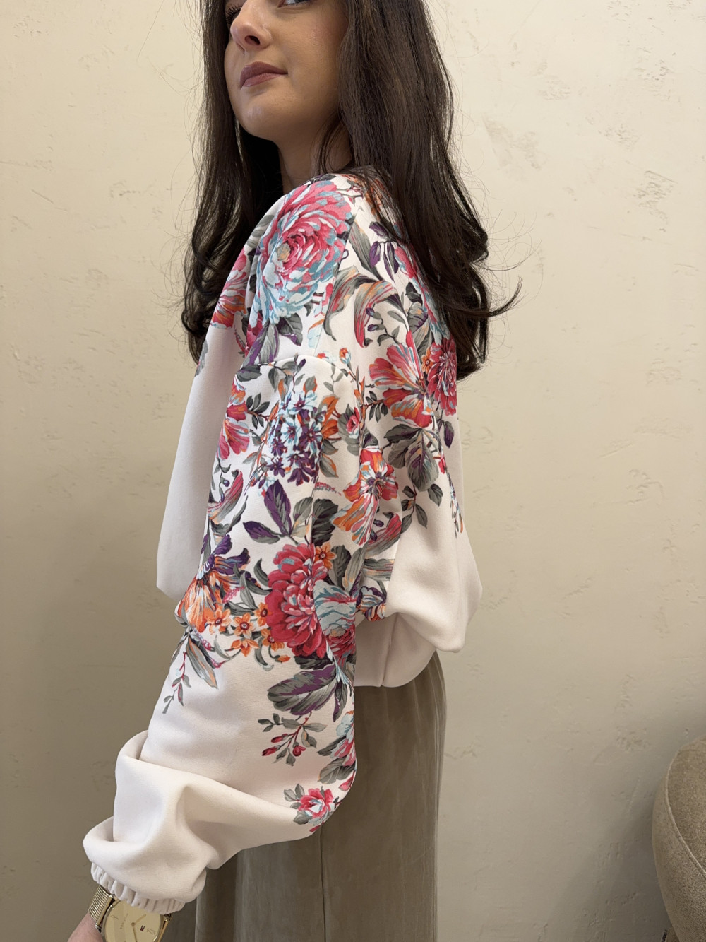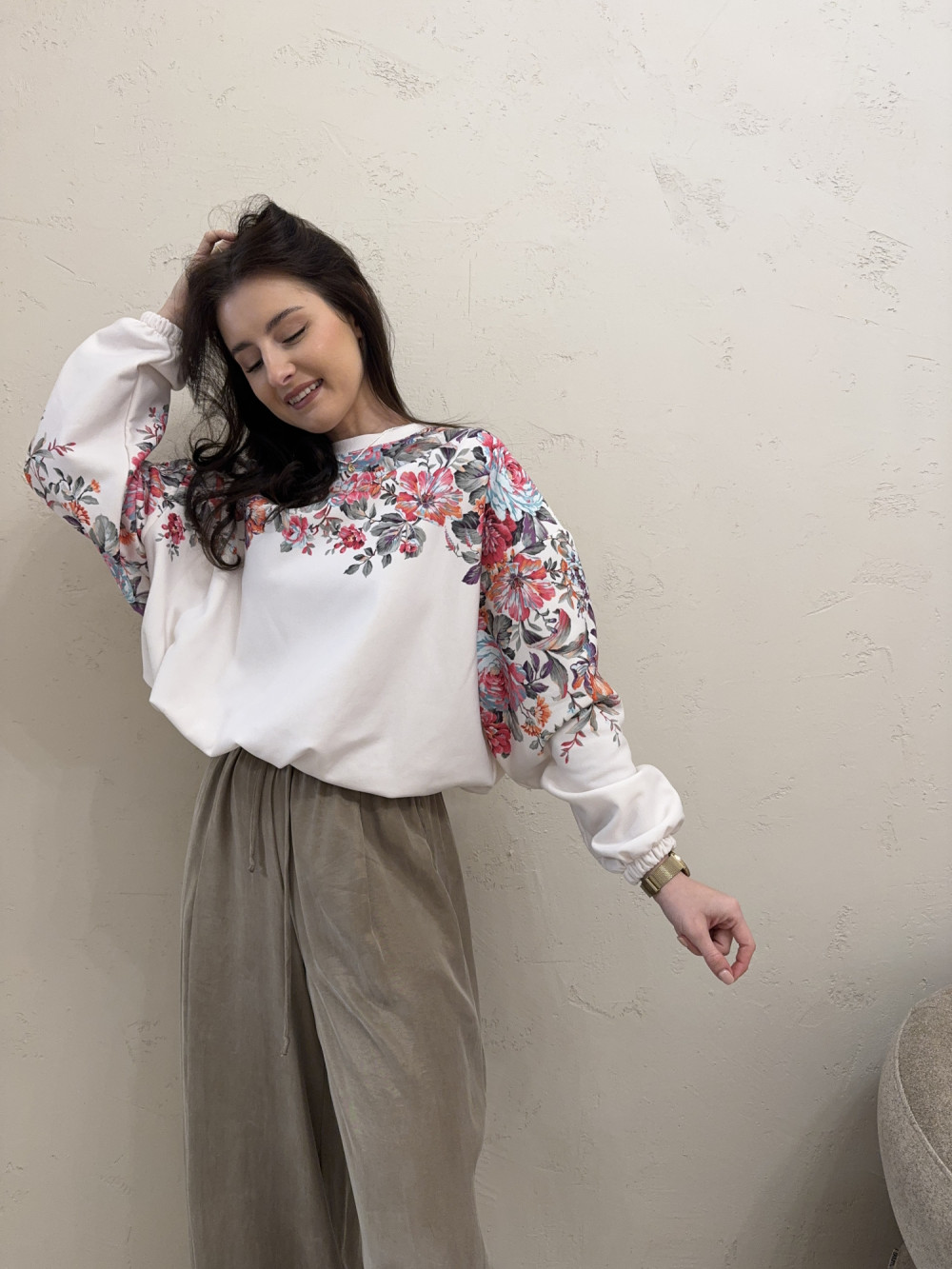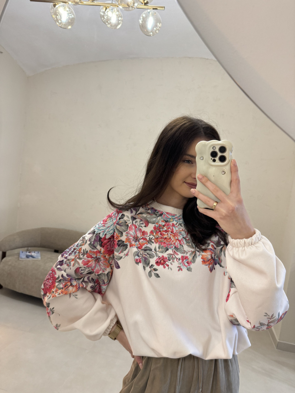 Bluza o kroju oversize ze ściągaczem u dołu biała w kolorowe kwiaty LIZZY