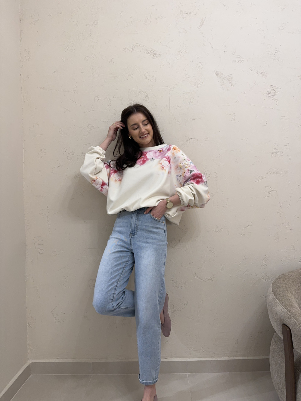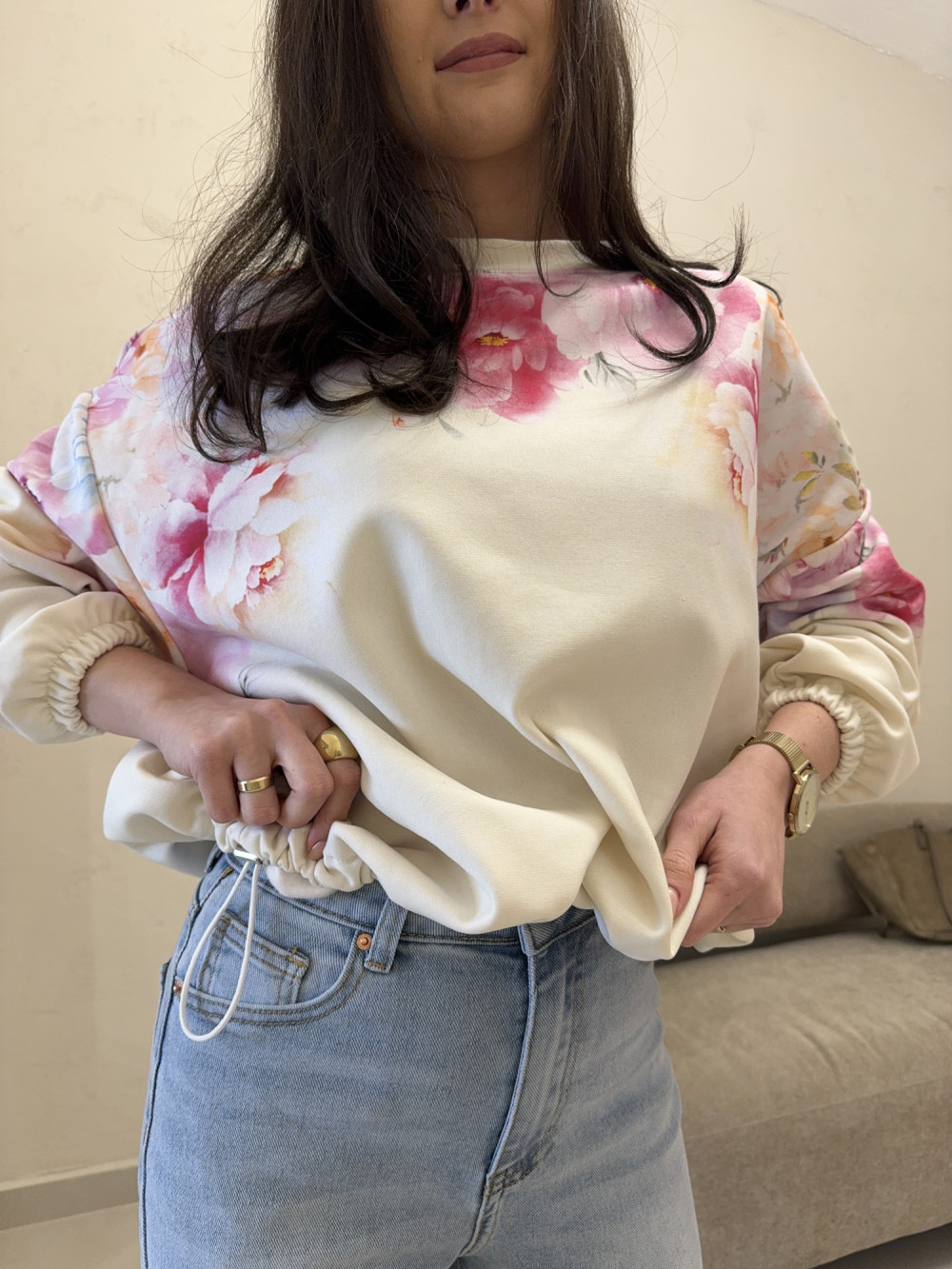 Bluza o kroju oversize ze ściągaczem u dołu beżowa w pastelowe kwiaty LIZZY