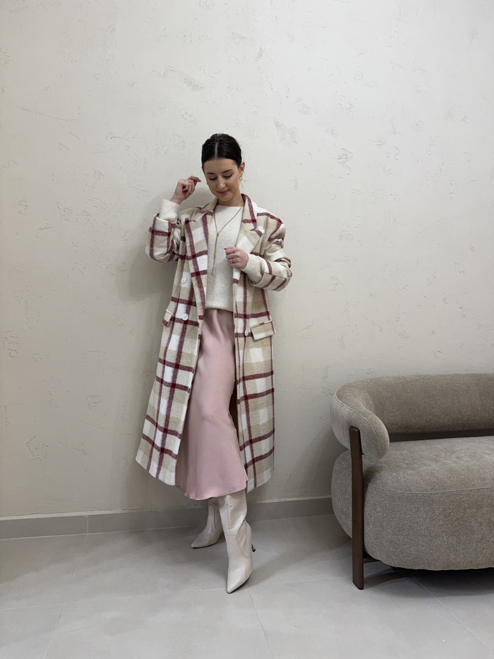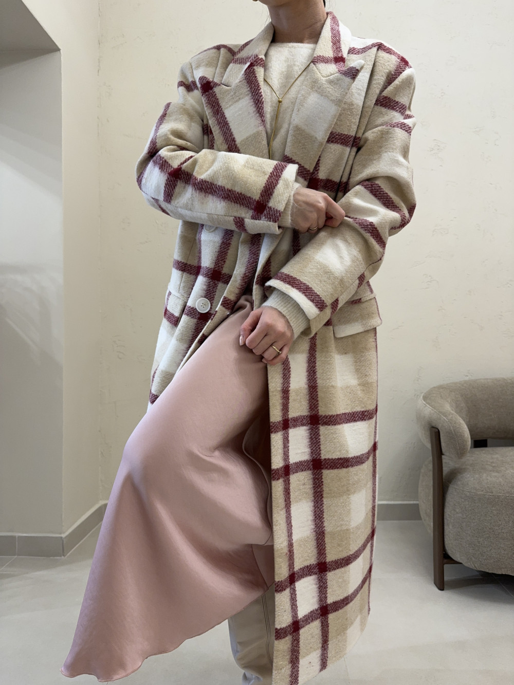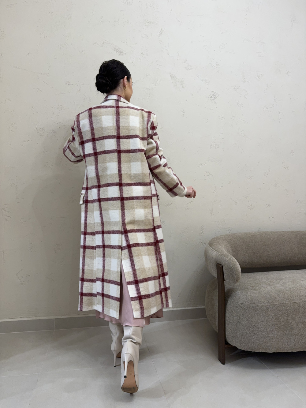 Płaszcz w kratę o kroju midi 20% wełny bordowy RAMZES
