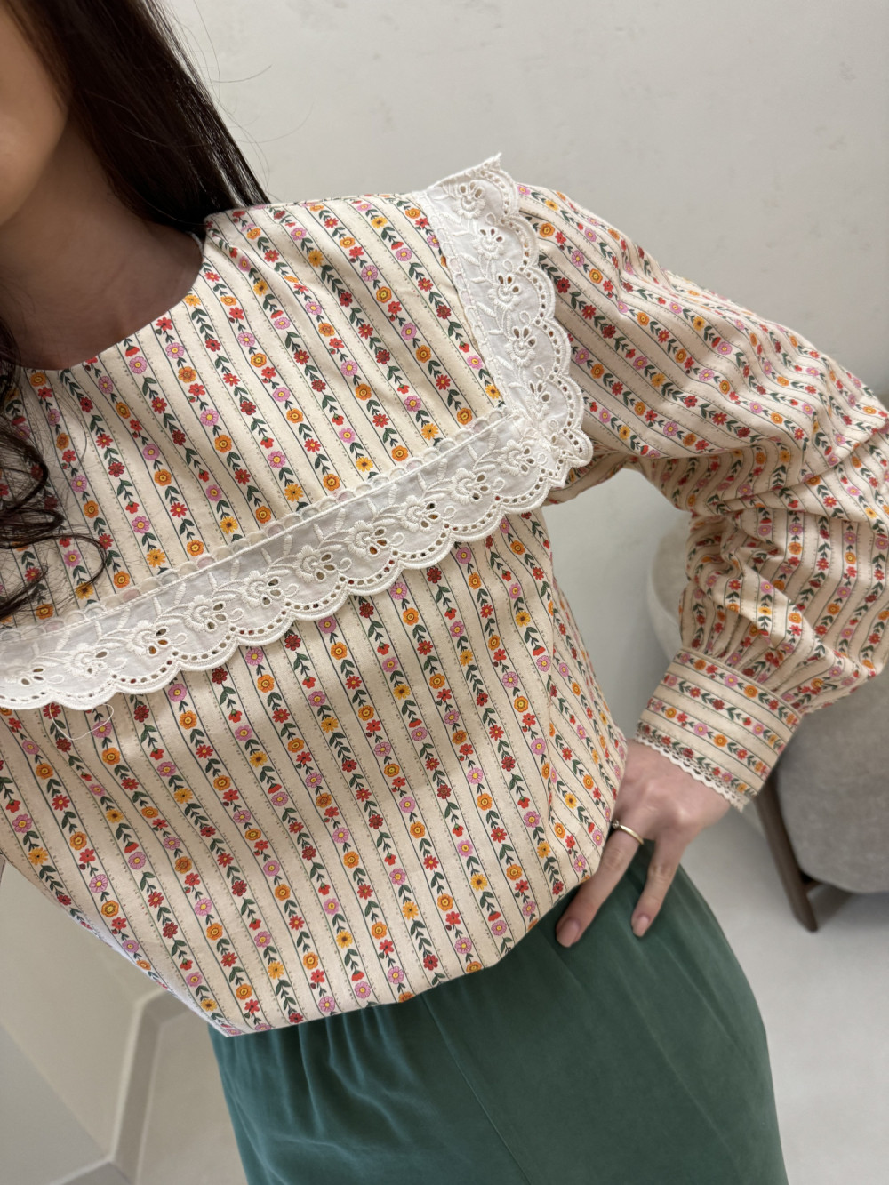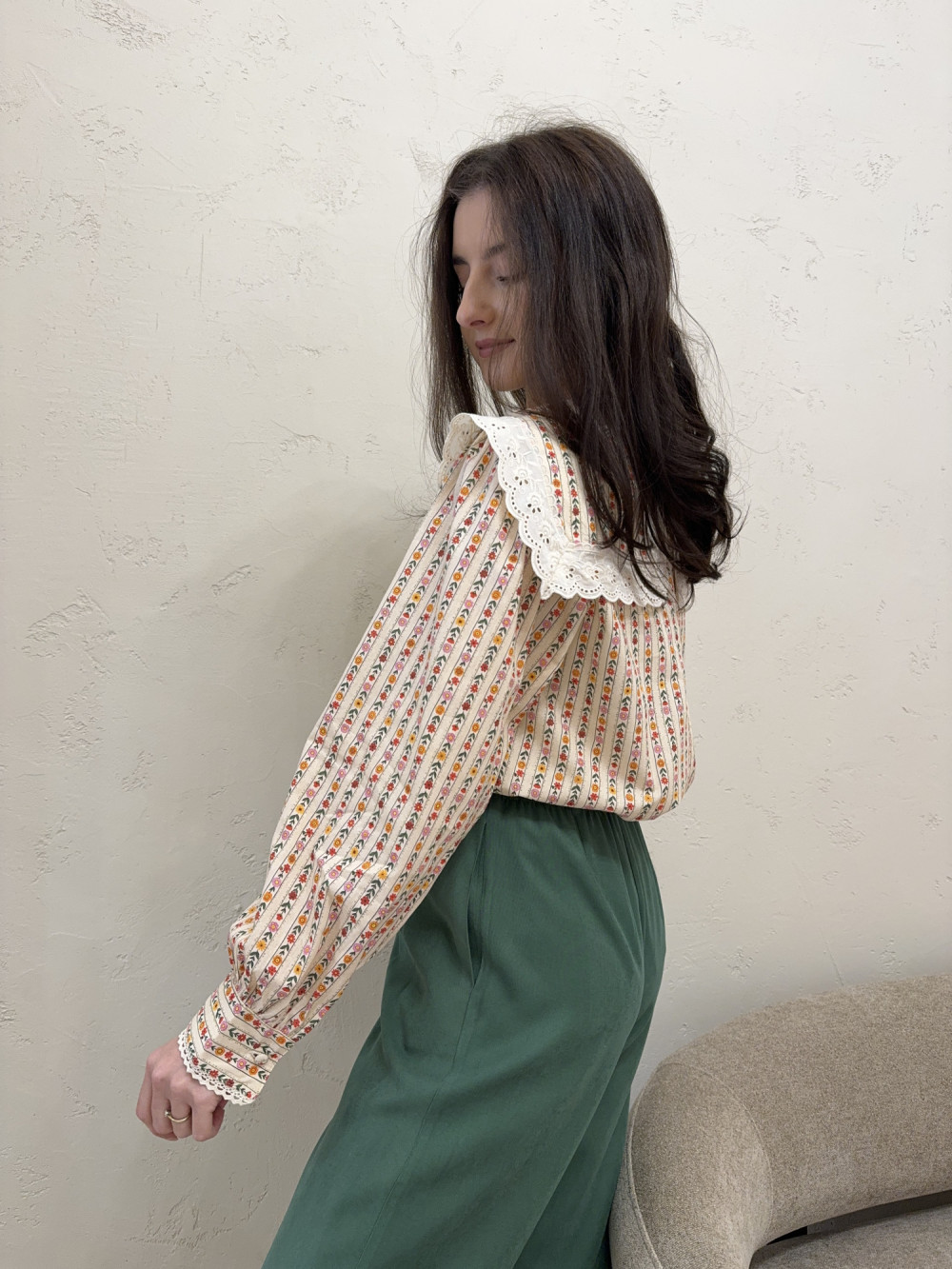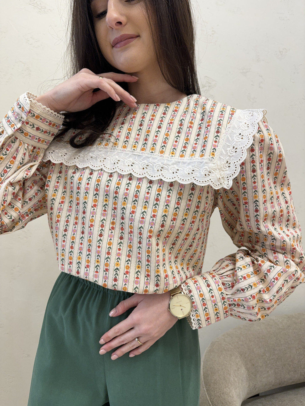 Bluzka zachwyca drobnym, kwiatowym wzorem i klasycznym kołnierzem. Wykonana w 100% z bawełny, jest przewiewna, lekka i bardzo komfortowa w noszeniu. Delikatny deseń sprawia, że koszula wygląda niezwykle kobieco i świeżo. Luźniejszy krój pięknie układa się na sylwetce. Idealna zarówno do codziennych stylizacji, jak i bardziej eleganckich zestawów.