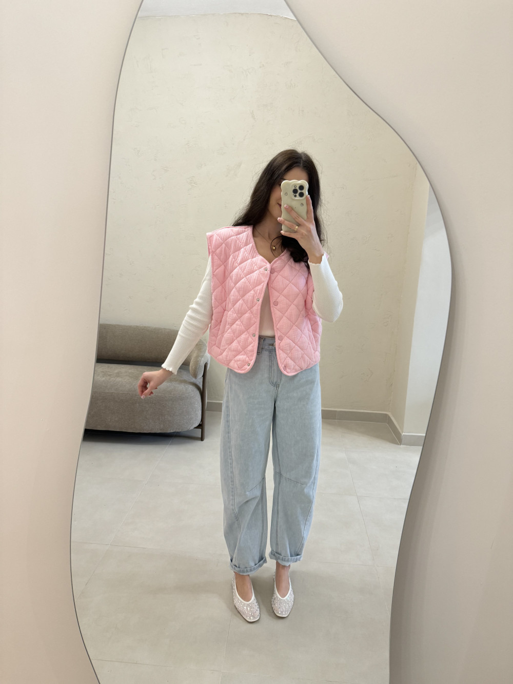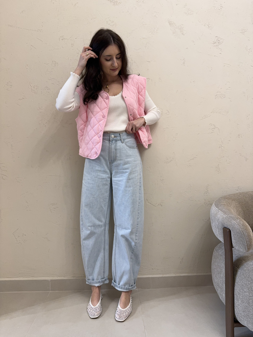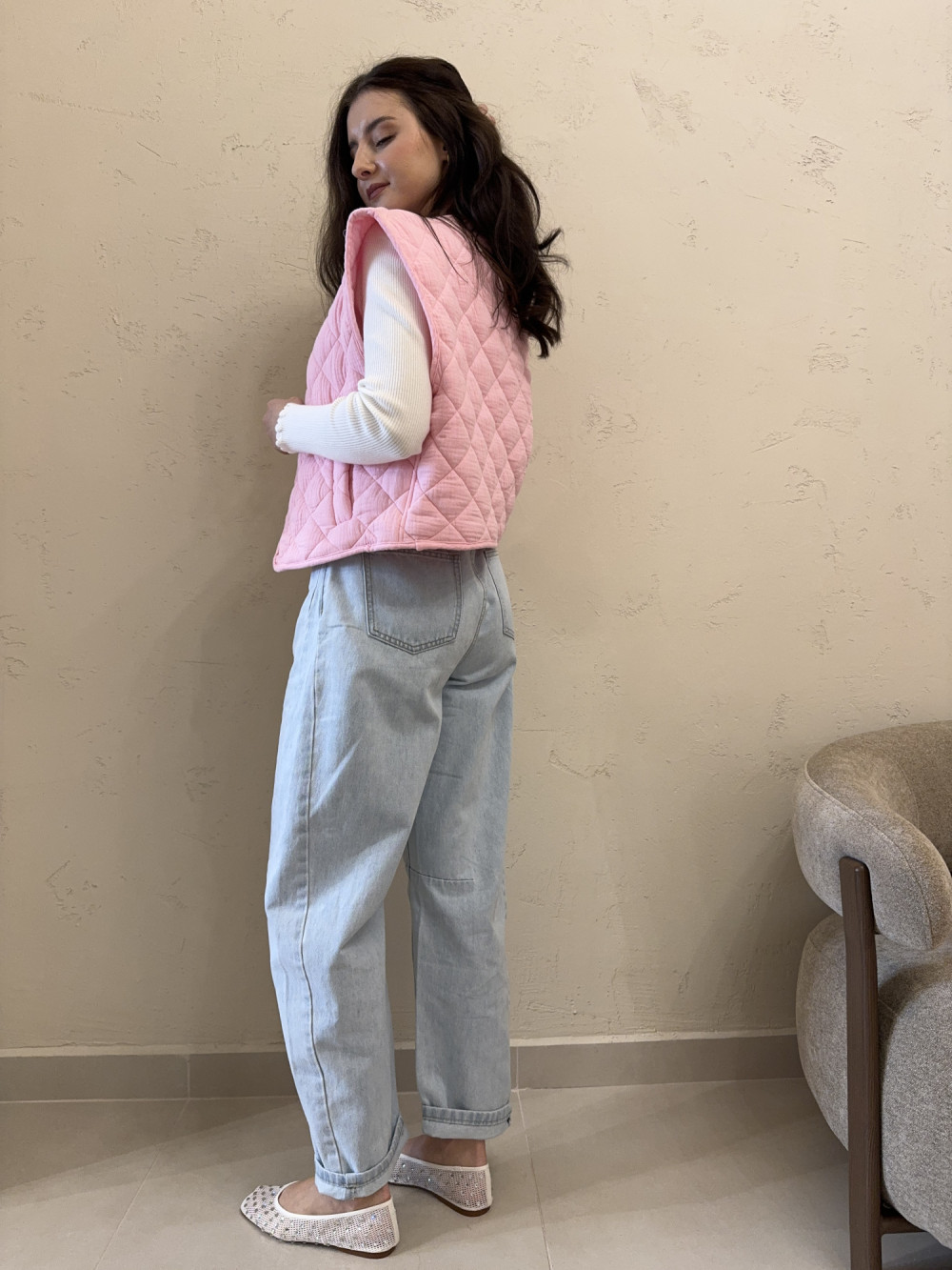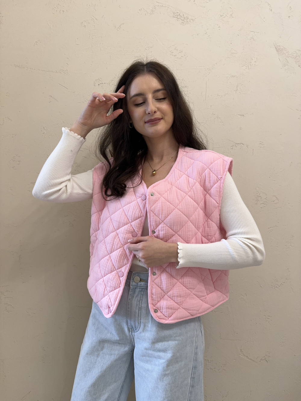 Pikowana kamizelka wykonana w 100% z bawełny, o modnym, oversizowym kroju. Lekka forma sprawia, że doskonale sprawdzi się jako warstwa przejściowa na bluzę, sweter lub koszulę. Starannie przeszywana struktura dodaje jej charakteru, a luźny fason zapewnia pełną swobodę ruchów. To stylowy dodatek, który łatwo dopasujesz do wielu zestawów.