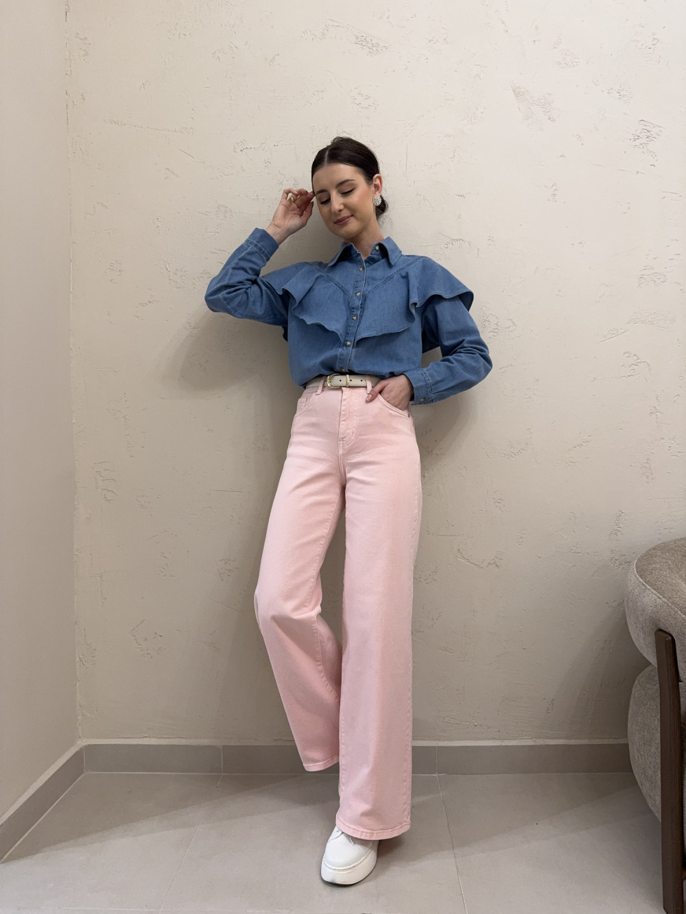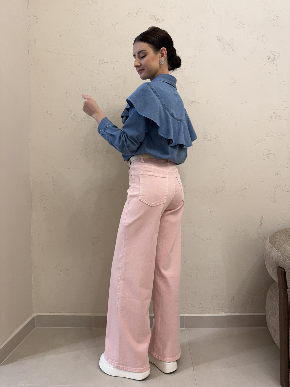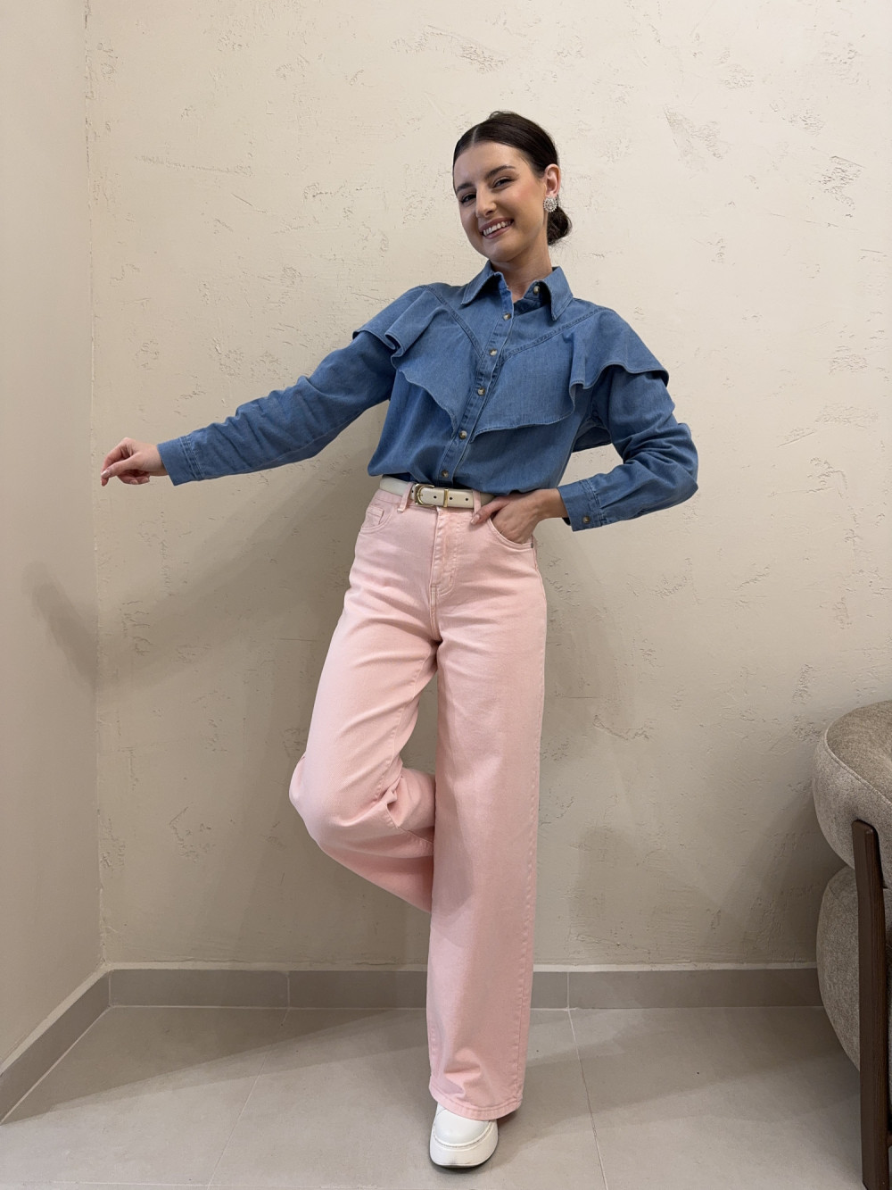 Różowe jeansy z wysokim stanem i szeroką nogawką, które łączą wygodę z modnym, świeżym kolorem. Uszyte z miękkiego denimu z przewagą bawełny w składzie — dzięki temu są przyjemne dla skóry i dobrze pracują podczas ruchu. Szeroka nogawka nadaje sylwetce lekkości i nowoczesnego charakteru, a wysoki stan pięknie zaznacza talię. Idealne do stylizacji zarówno casualowych, jak i bardziej kobiecych.