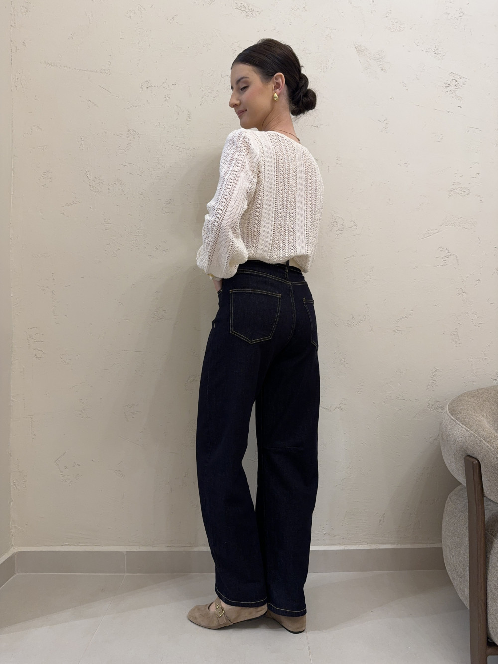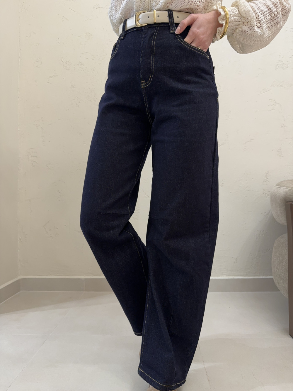 Jeansy z wysokim stanem i luźną, prostą nogawką w stylu barrel. Model pięknie podkreśla talię, a jednocześnie daje pełen komfort noszenia dzięki miękkiemu, elastycznemu w odczuciu dżinsowi. Materiał jest przyjemny i „miękko układający się”, dzięki czemu spodnie nie są sztywne jak klasyczny surowy jeans. Klasyczny, ciemnogranatowy kolor wysmukla sylwetkę i pasuje praktycznie do wszystkiego.