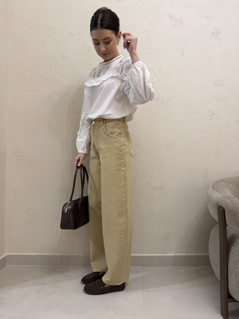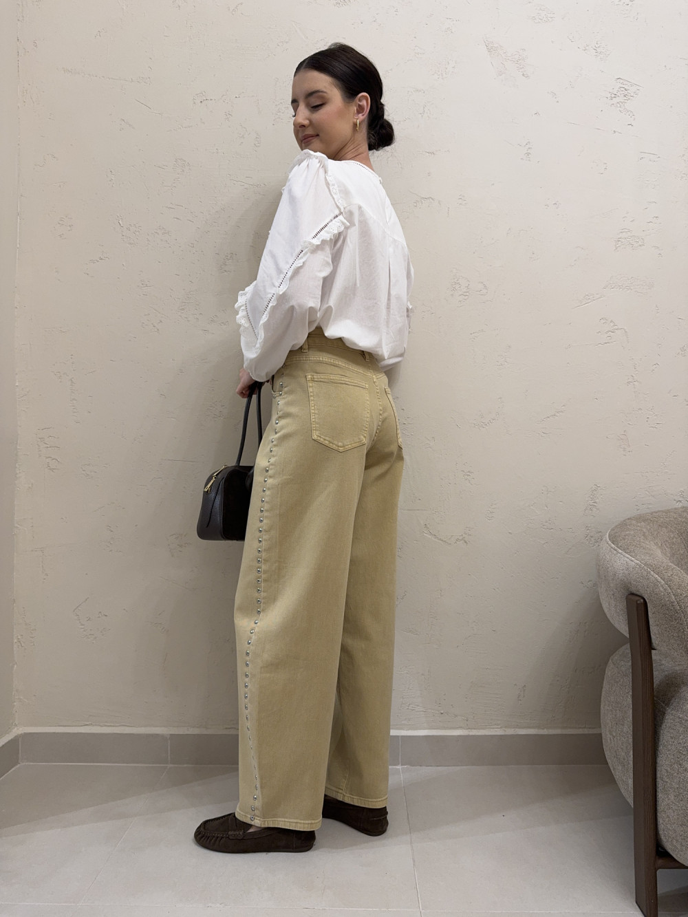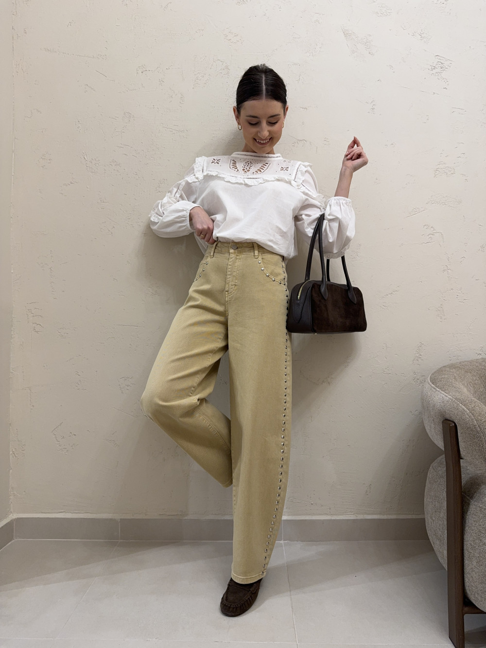 Spodnie z wysokim stanem wykonane z miękkiego jeansu z przewagą bawełny, dzięki czemu są komfortowe w noszeniu i dobrze dopasowują się do sylwetki. Materiał jest przyjemny w dotyku, lekko elastyczny i nie jest sztywny jak klasyczny denim. Po bokach nogawek wszyte są ozdobne dżety, które subtelnie podkreślają linię nóg i dodają całości charakteru. Musztardowy odcień świetnie komponuje się z beżami, bielą, jeansem i czernią, dzięki czemu spodnie są bardzo stylizacyjnie uniwersalne.