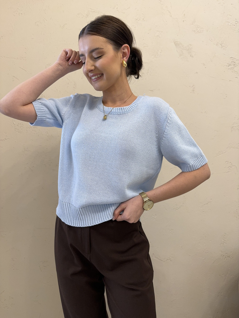Sweterek z krótkim rękawem wykonany w 80% z naturalnej bawełny. Oddychający materiał sprawia, że doskonale sprawdzi się przez cały sezon. Starannie uszyty, z dbałością o każdy detal — produkt polskiej produkcji o świetnej jakości. Klasyczna forma pozwala łatwo łączyć go zarówno ze spodniami, jak i spódnicami. Ponadczasowy model, który szybko stanie się bazą Twojej garderoby.