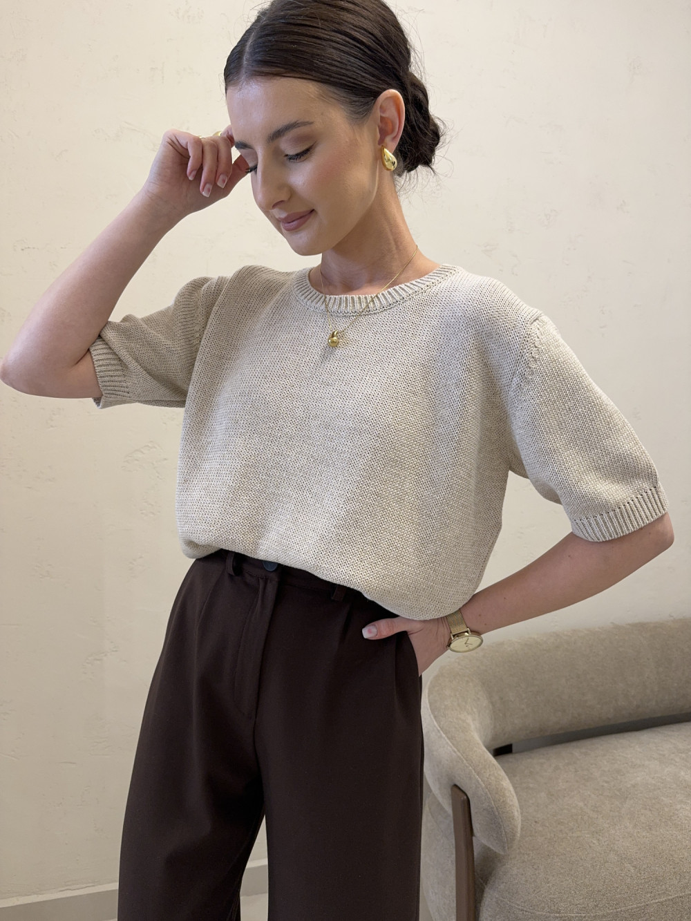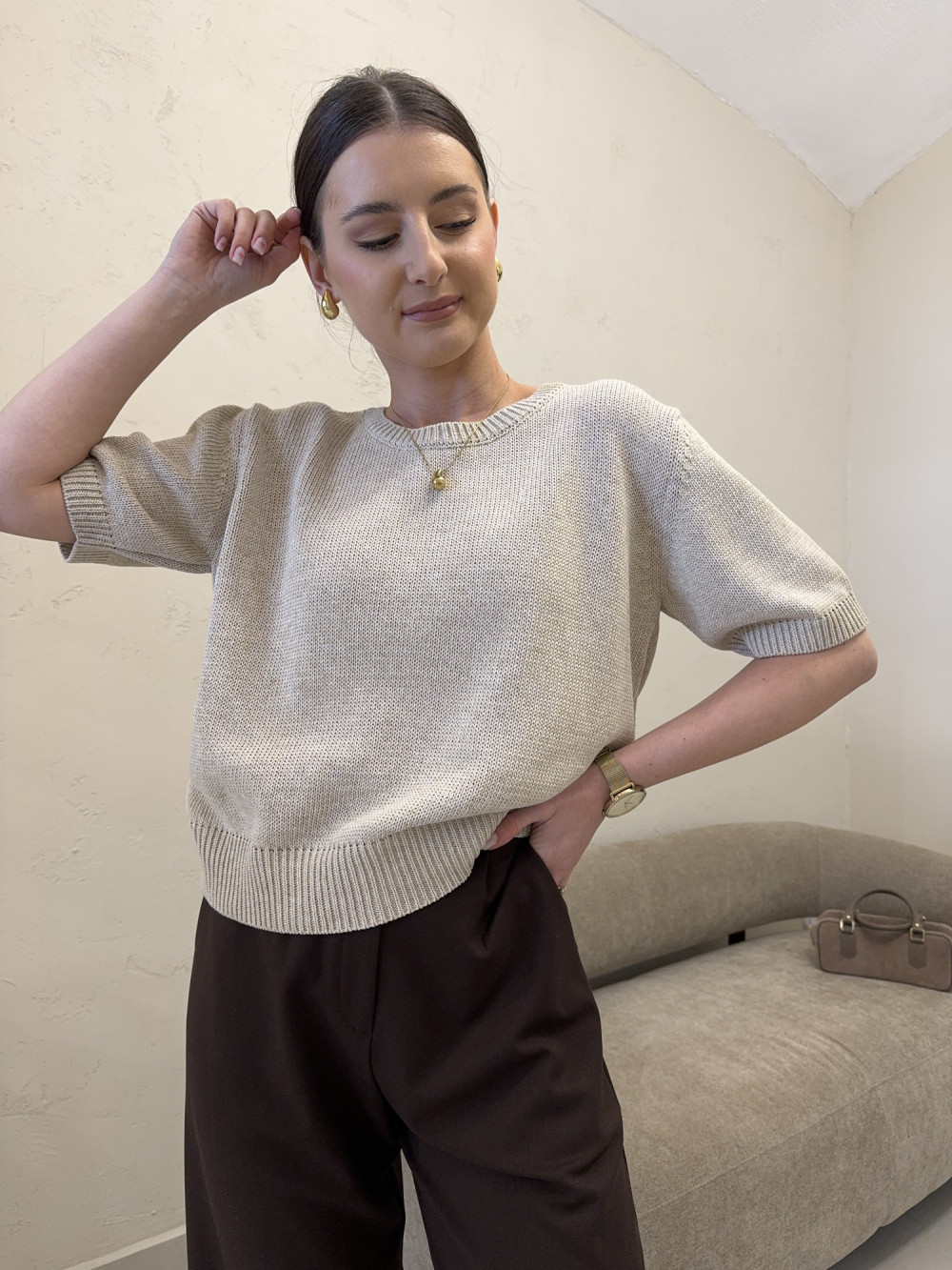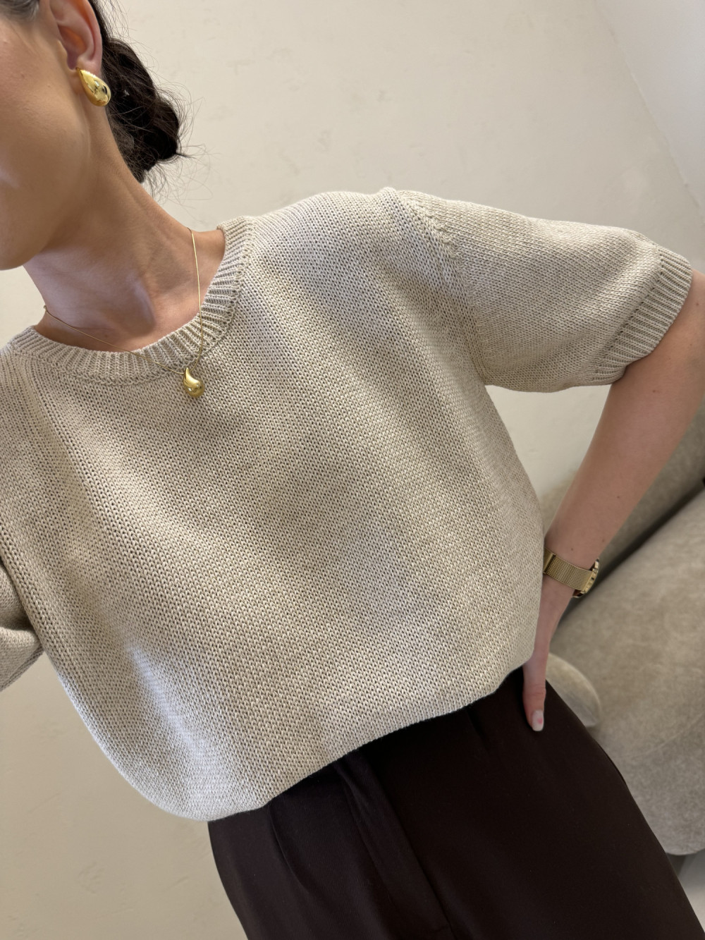 Sweter krótki rękaw 80% bawełna beżowy ISOLDE
