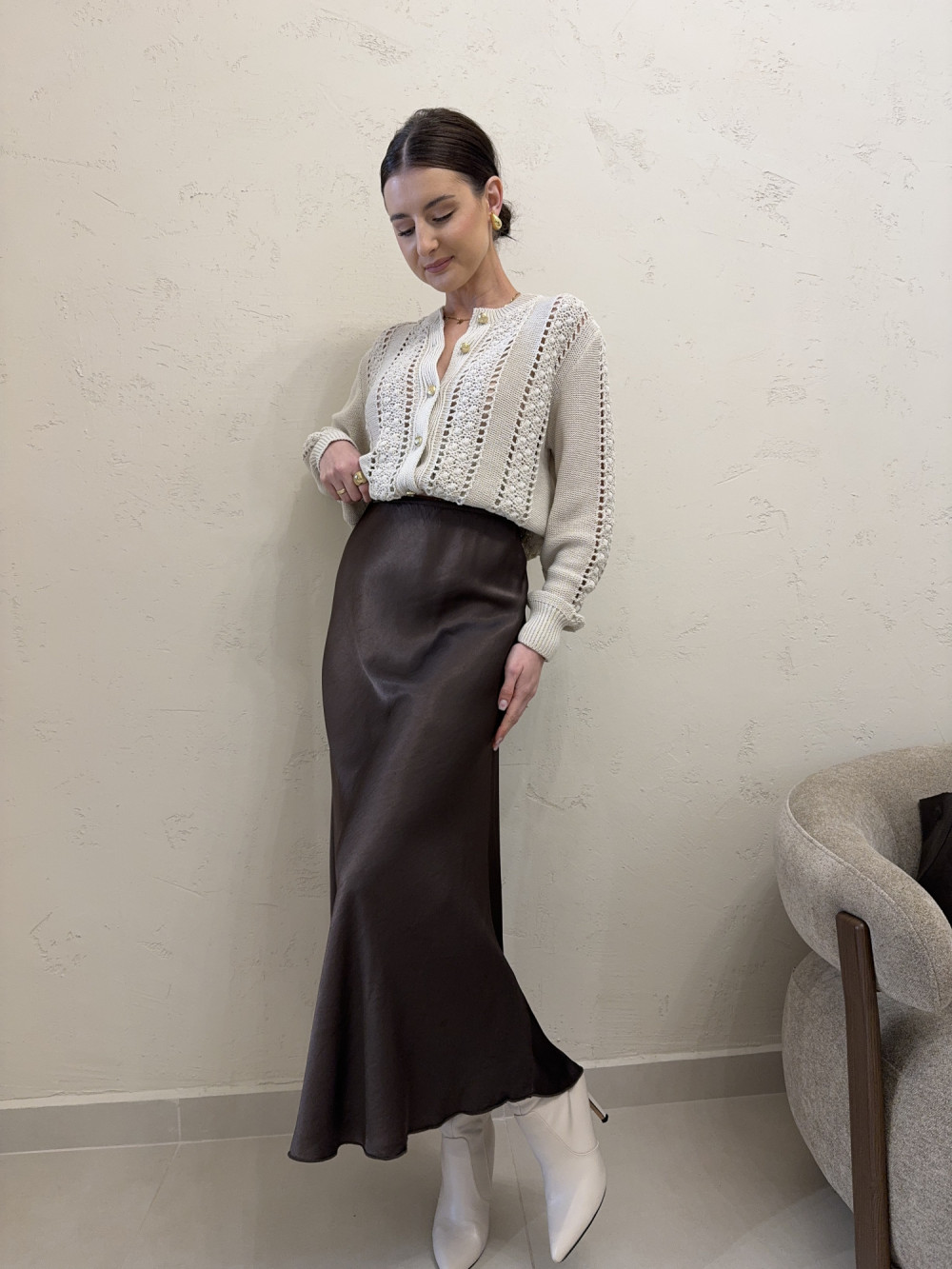 Spódnica midi satynowa 100% wiskoza czekoladowa NEL