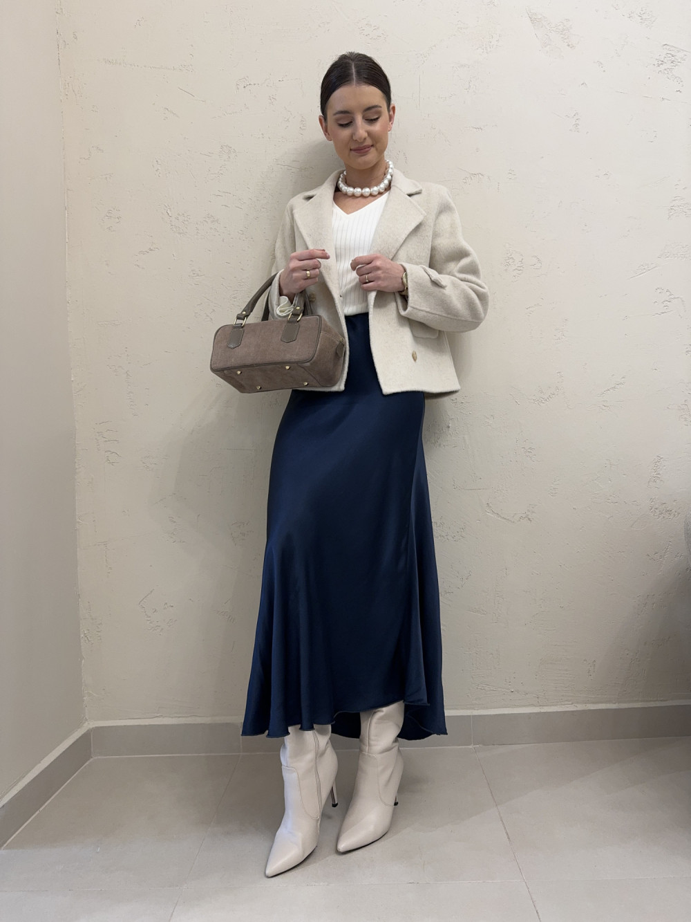 Krótka marynarko-kurtka uszyta w 78% z naturalnej wełny — ciepła, miękka i wyraźnie „premium” w dotyku. Model bez podszewki, ale dzięki jakości tkaniny doskonale chroni przed chłodem. Prosty fason, zapinany na guziki, z dopracowanymi kieszeniami i klasycznymi klapami. Nie jest mocno oversize’owa — pięknie układa się na sylwetce, tworząc elegancką, ale nowoczesną linię.