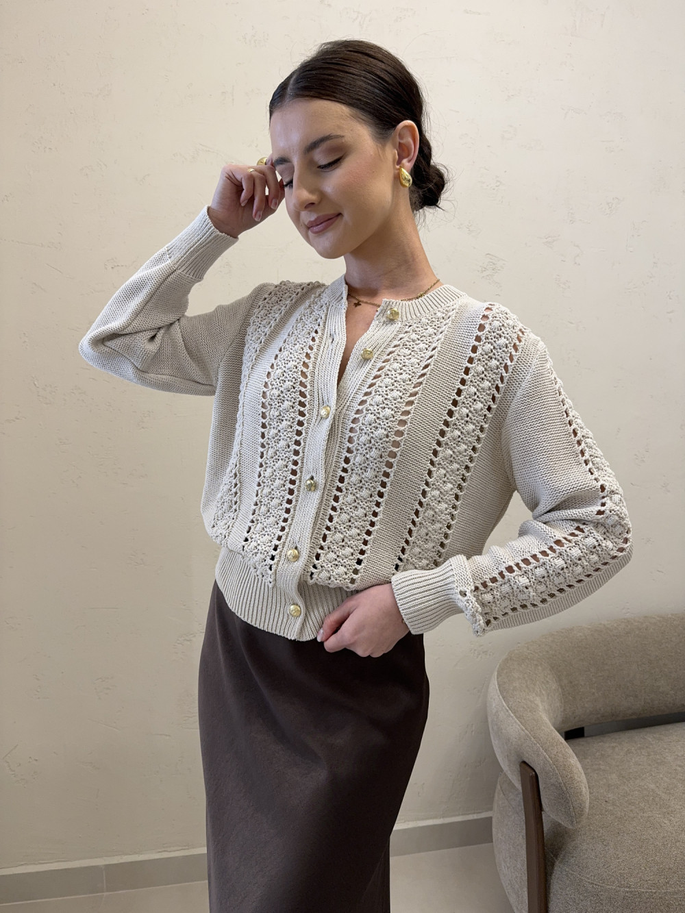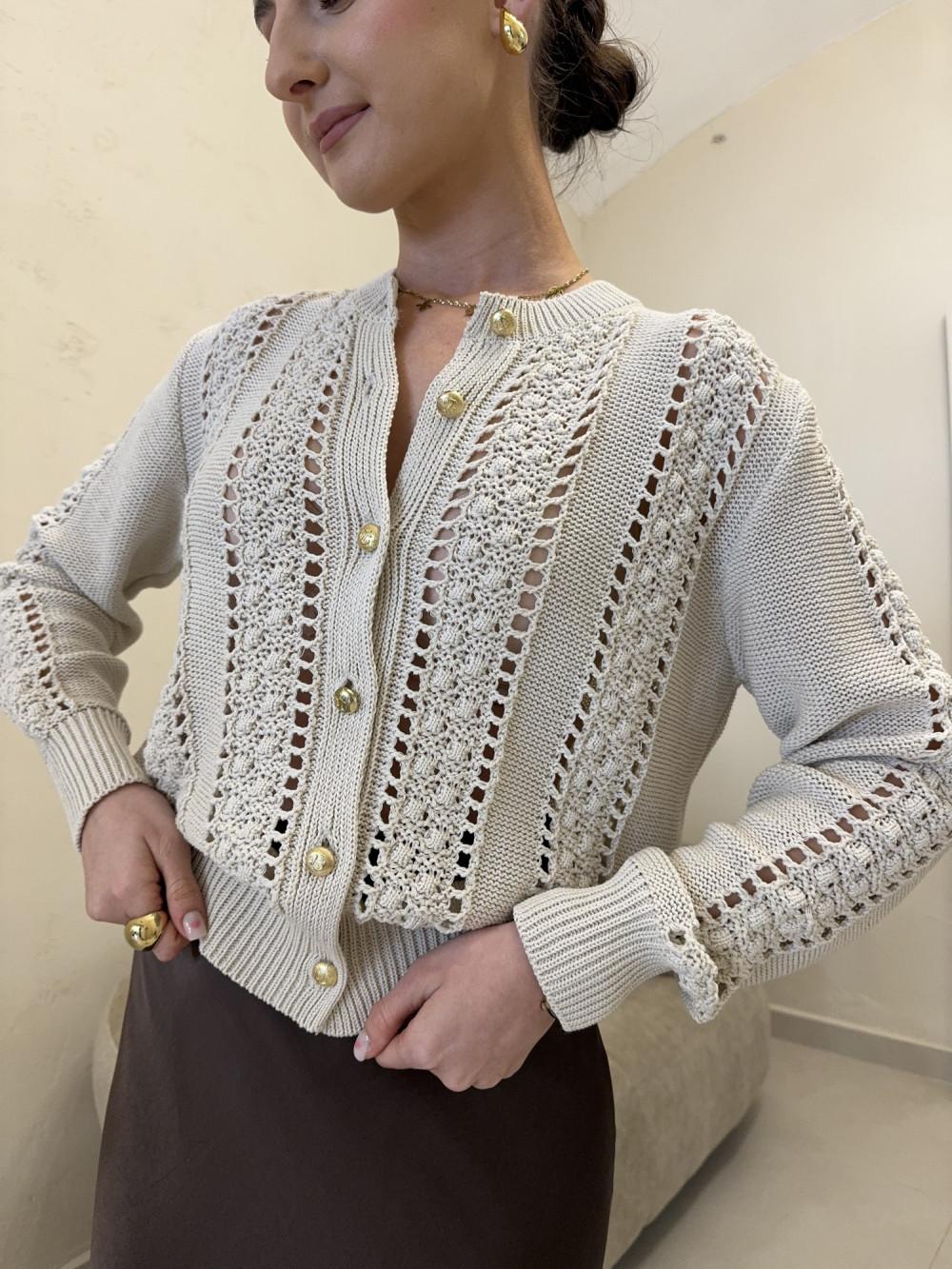 Kardigan ażurowy ze złotymi guzikami beżowy CELESTINE