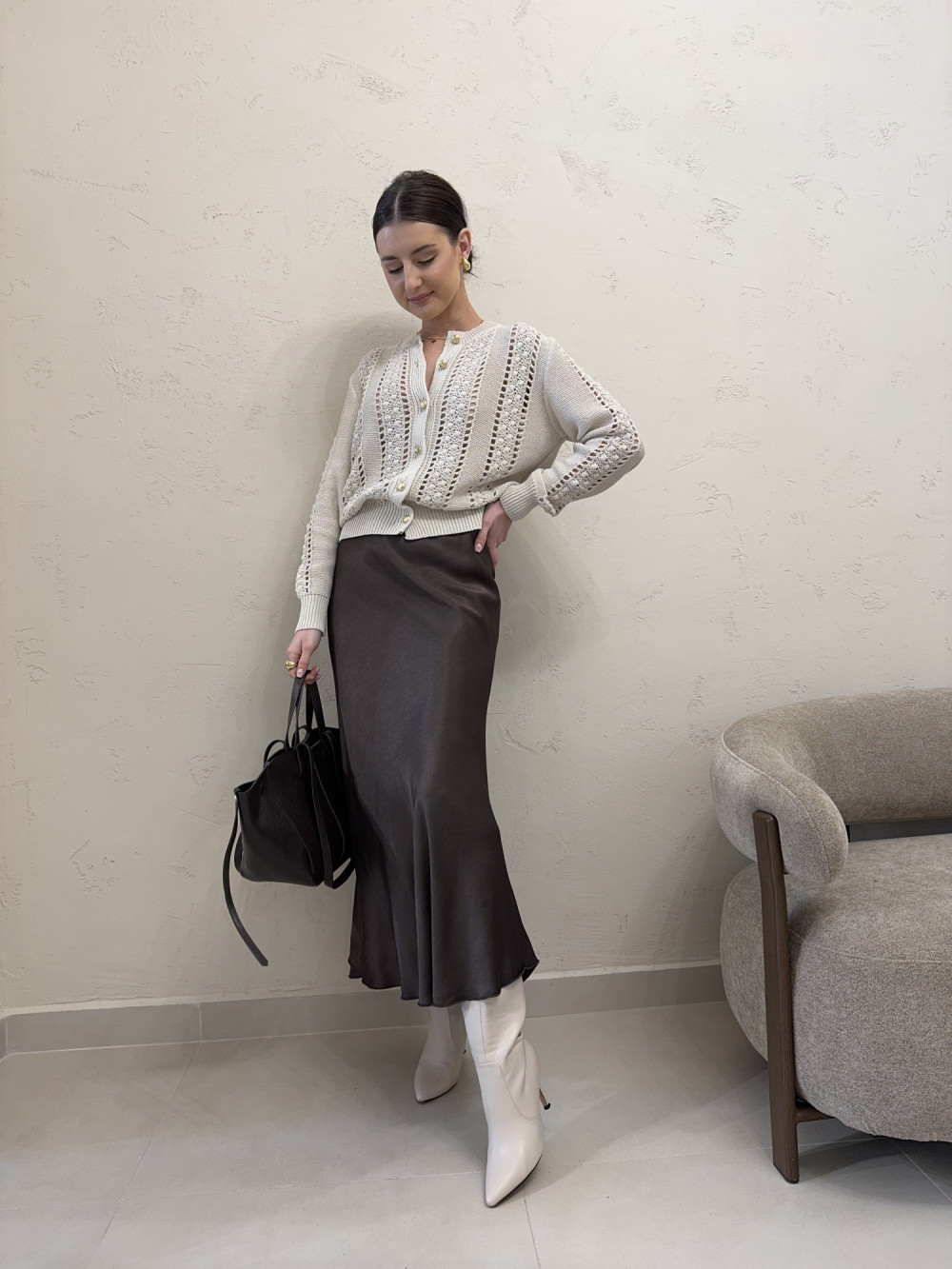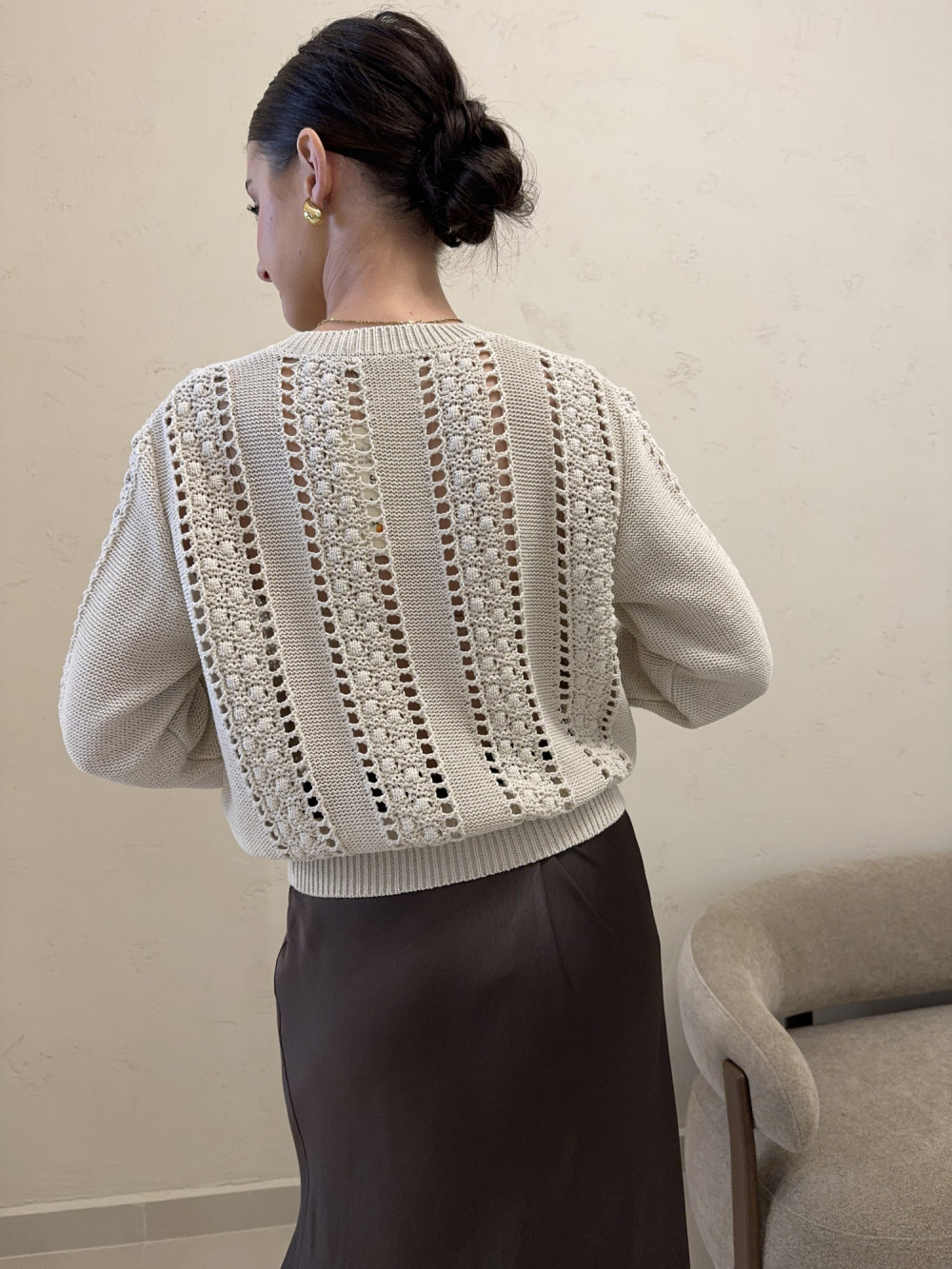 Polskiej produkcji sweterek zapinany na złote guziczki, wykonany w 80% z bawełny. Ażurowy splot nadaje mu lekkości i subtelnej romantyczności, a precyzyjne wykończenia podkreślają wysoką jakość wykonania. Każdy detal jest tu dopracowany — od struktury dzianiny po mankiety i dół sweterka. Idealny jako delikatna warstwa do sukienek, spódnic i spodni z wysokim stanem.