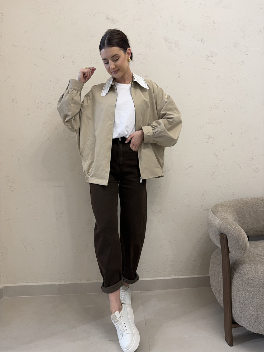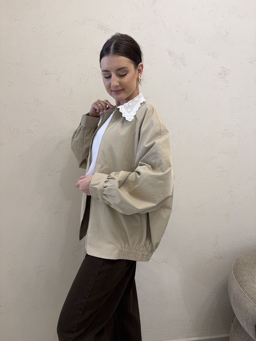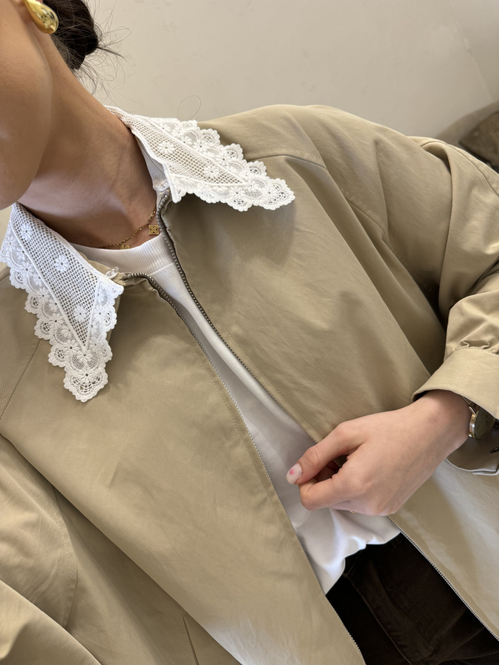 Oversizowa kurtka z bawełnianą warstwą wierzchnią i podszewką, zapinana na guziki. Wyjątkowym detalem jest odpinany koronkowy kołnierzyk — przypinany na guziczki, dzięki czemu możesz nosić kurtkę w dwóch odsłonach: romantycznej lub bardziej minimalistycznej. Bufiaste rękawy i luźny krój nadają jej modowego charakteru, a staranne przeszycia podkreślają dopracowaną formę.