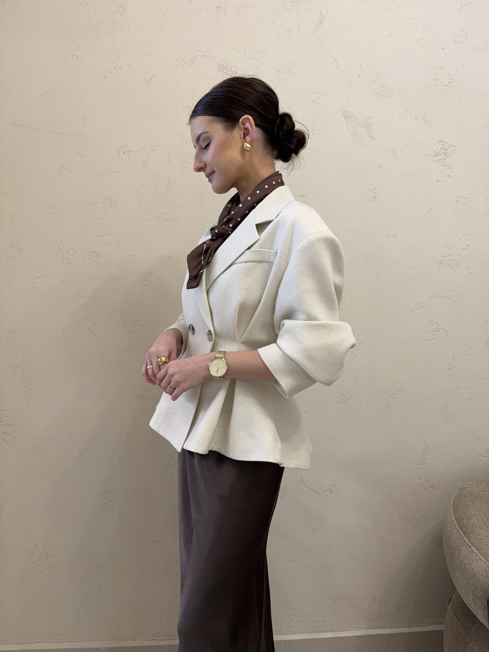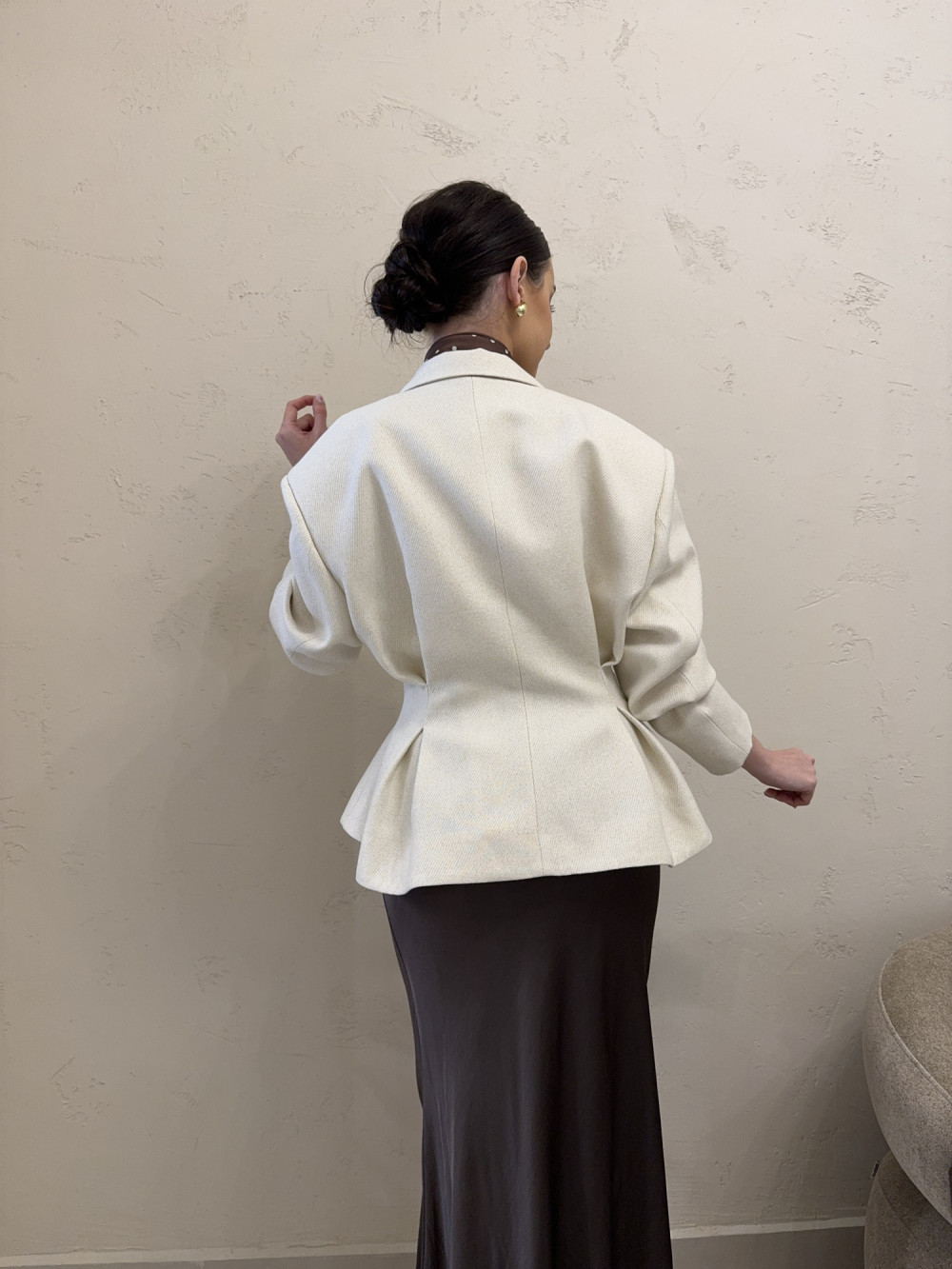 Marynarka o dopracowanej, kobiecej konstrukcji, uszyta w Polsce z dbałością o każdy detal. Model ma lekko opuszczoną linię ramion z wszytymi poduszkami, dzięki czemu pięknie układa się na sylwetce i zachowuje elegancki kształt. Talia zapinana jest na guzik, a dół delikatnie się rozszerza, tworząc subtelnie rozkloszowaną linię. Klasyczne długie rękawy oraz podszewka podnoszą komfort noszenia, a tkanina z dodatkiem wiskozy nadaje całości miękkości i lekkości. To model, który łączy krawiecką formę z nowoczesną, kobiecą lekkością.