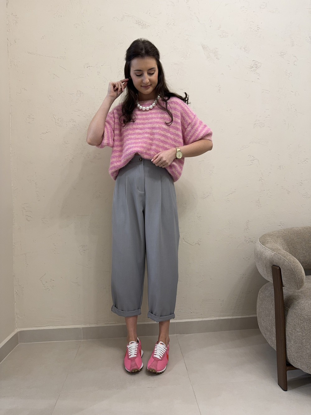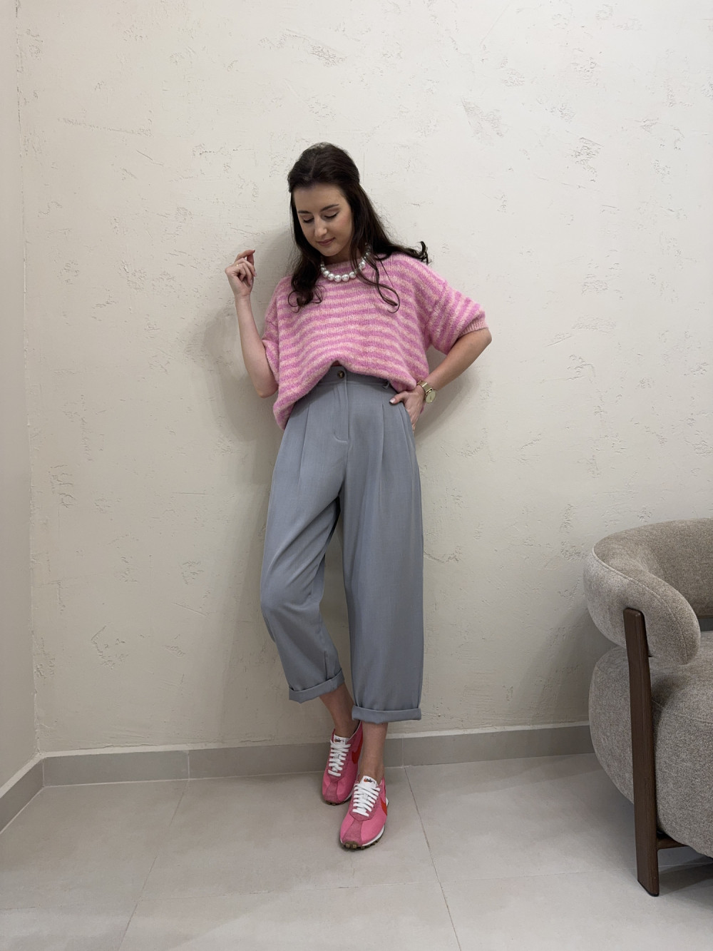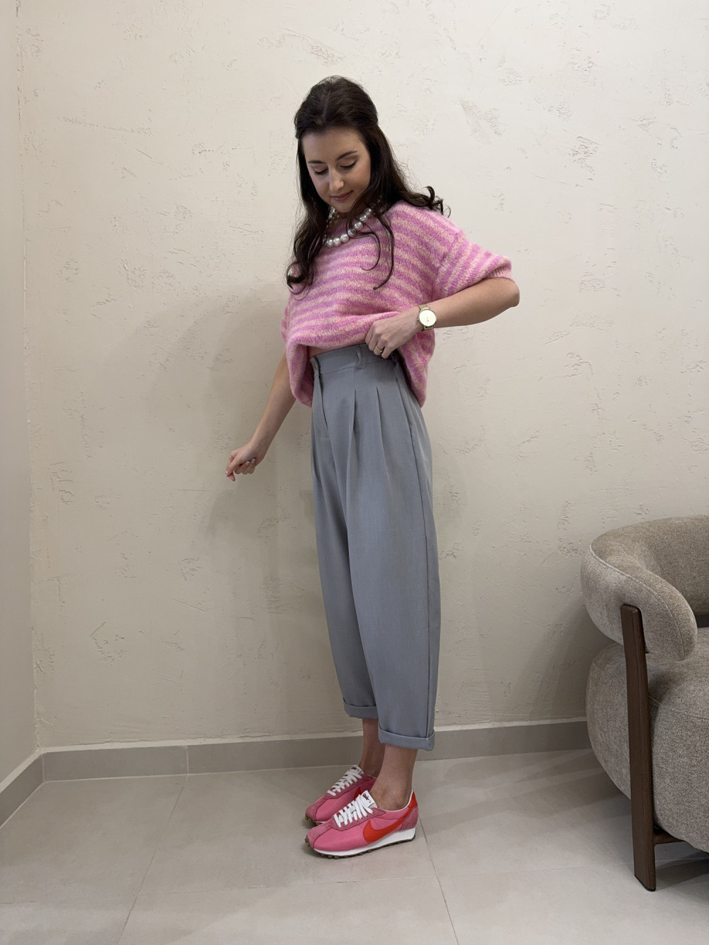 Luźne spodnie typu balloon z wysokim stanem, zaprojektowane tak, aby podkreślać talię i jednocześnie dawać pełną swobodę ruchów. Nogawki są lekko skrócone i miękko układają się na sylwetce, tworząc nowoczesną, modową linię. Model posiada kieszenie oraz wszytą z tyłu w pasie gumkę, która poprawia dopasowanie i komfort noszenia. Tkanina z dodatkiem wiskozy sprawia, że spodnie są miękkie, lekkie i bardzo przyjemne w użytkowaniu.