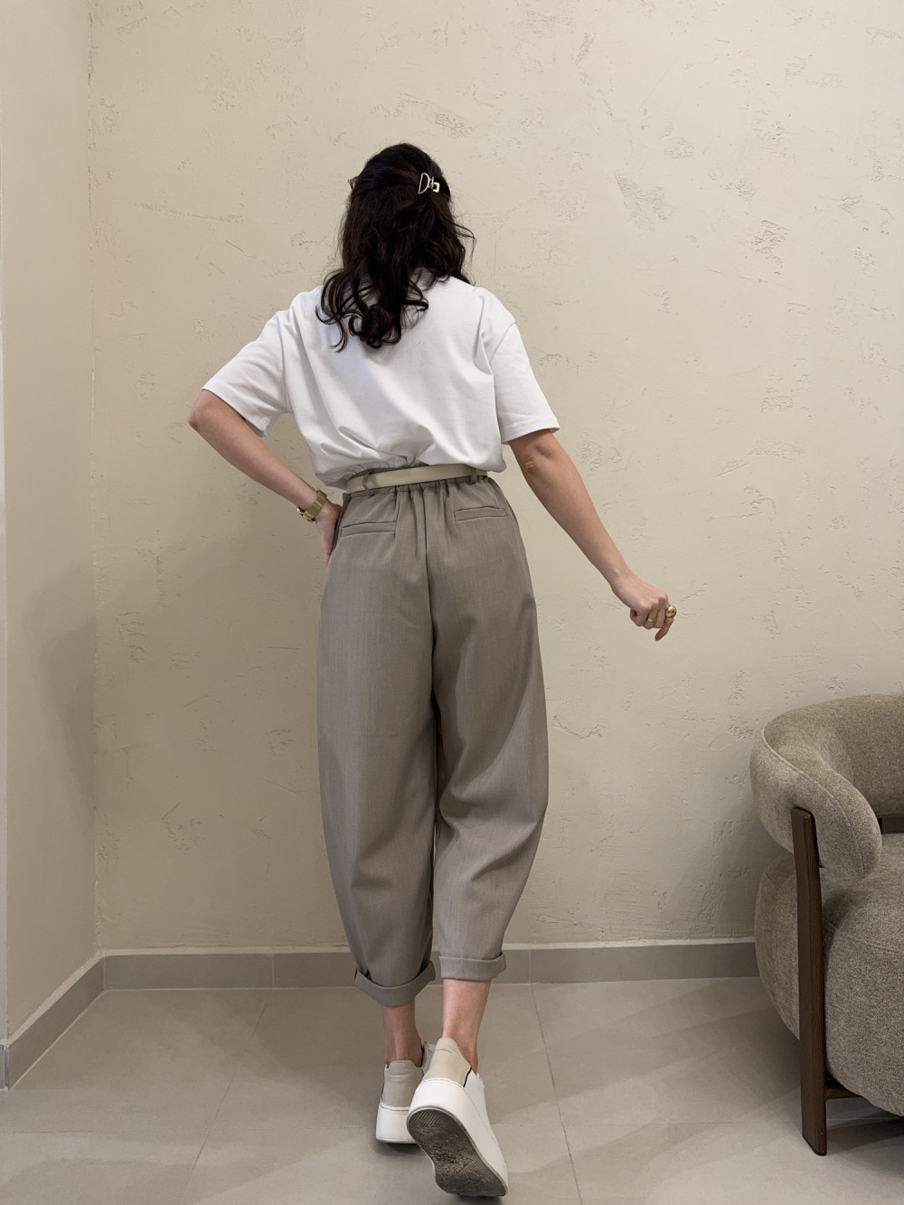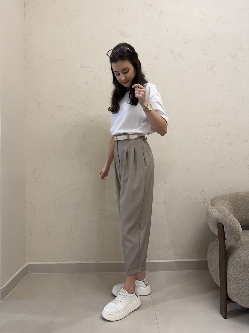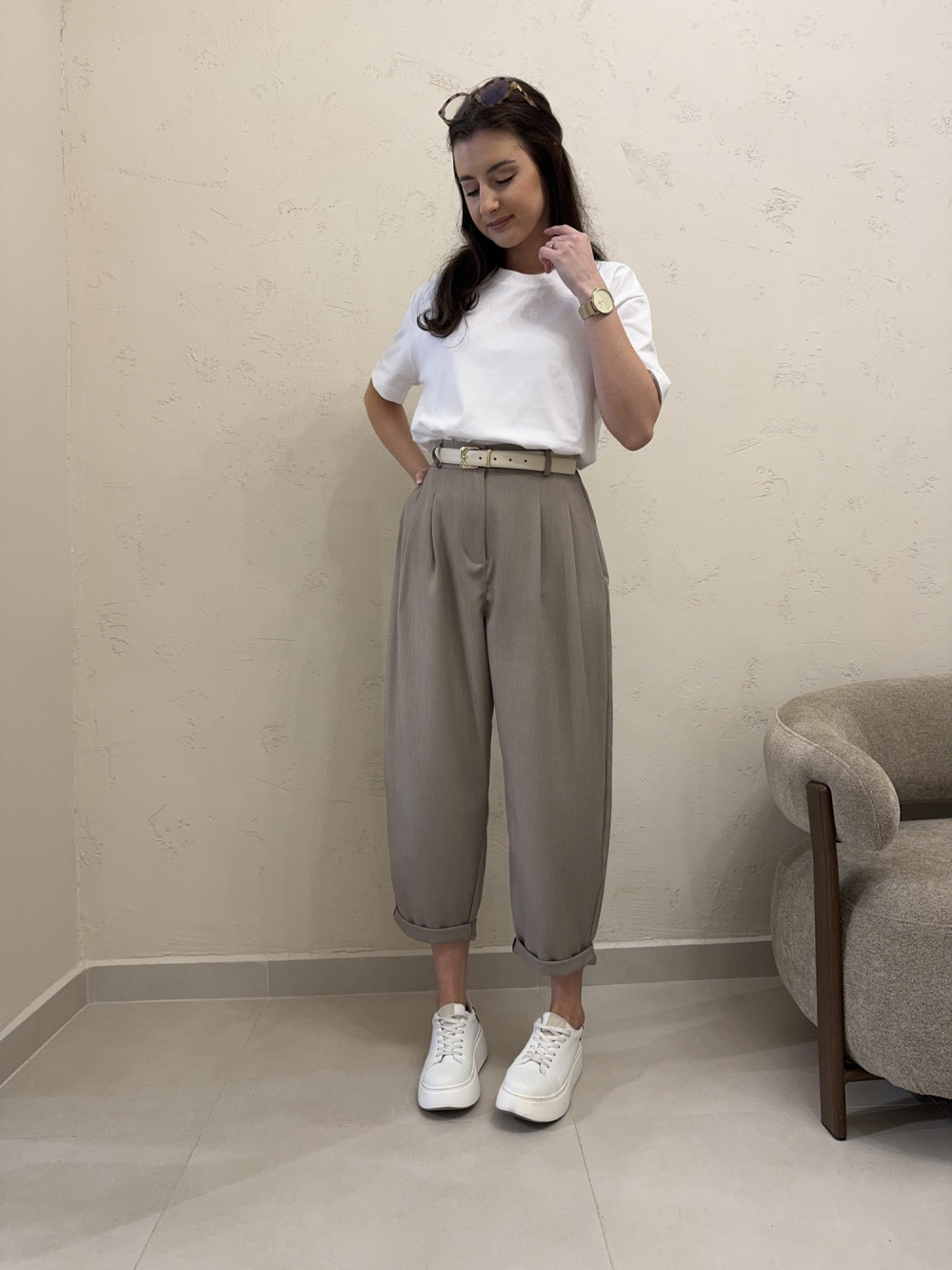 Luźne spodnie typu balloon z wysokim stanem, zaprojektowane tak, aby podkreślać talię i jednocześnie dawać pełną swobodę ruchów. Nogawki są lekko skrócone i miękko układają się na sylwetce, tworząc nowoczesną, modową linię. Model posiada kieszenie oraz wszytą z tyłu w pasie gumkę, która poprawia dopasowanie i komfort noszenia. Tkanina z dodatkiem wiskozy sprawia, że spodnie są miękkie, lekkie i bardzo przyjemne w użytkowaniu.