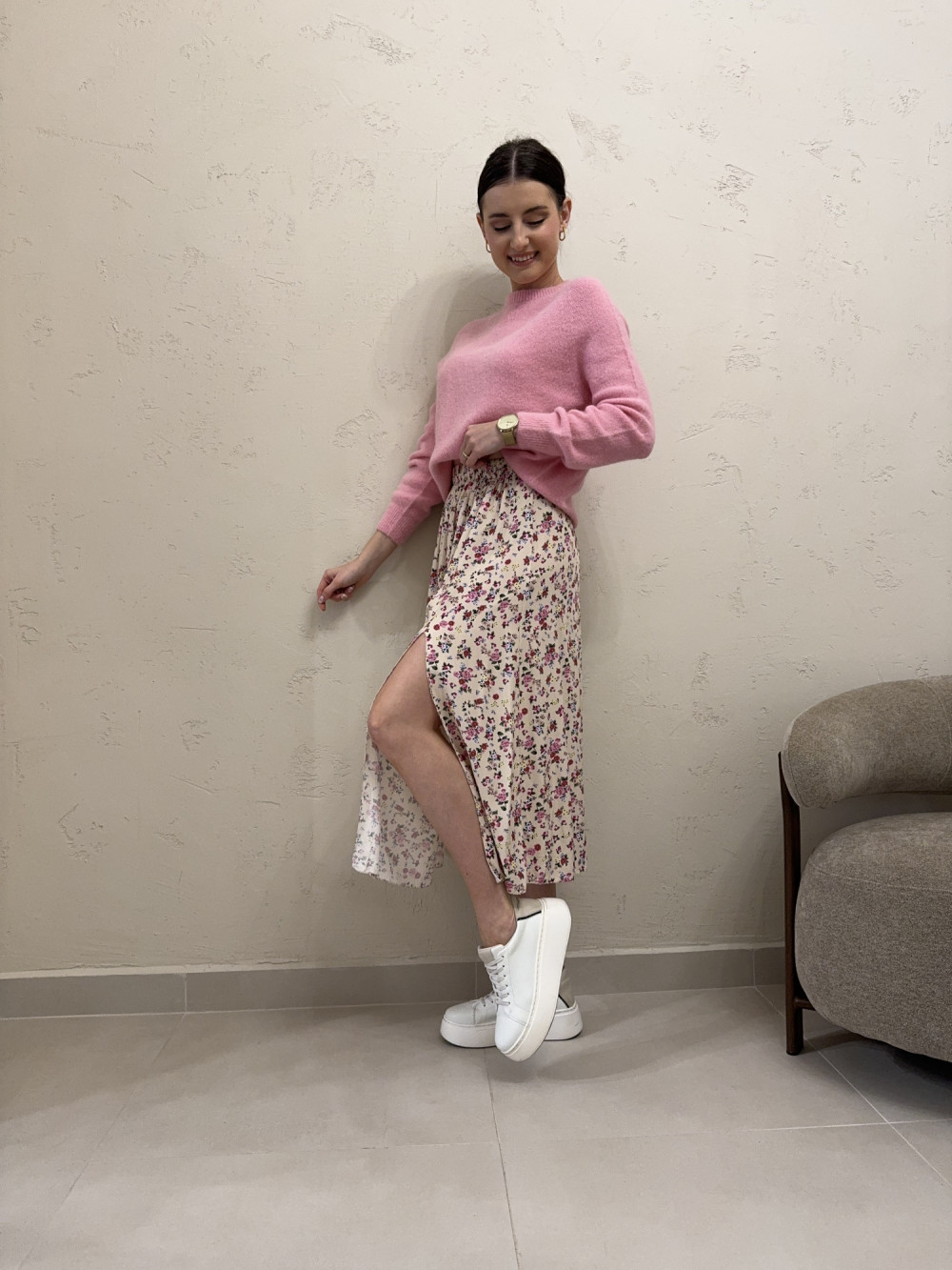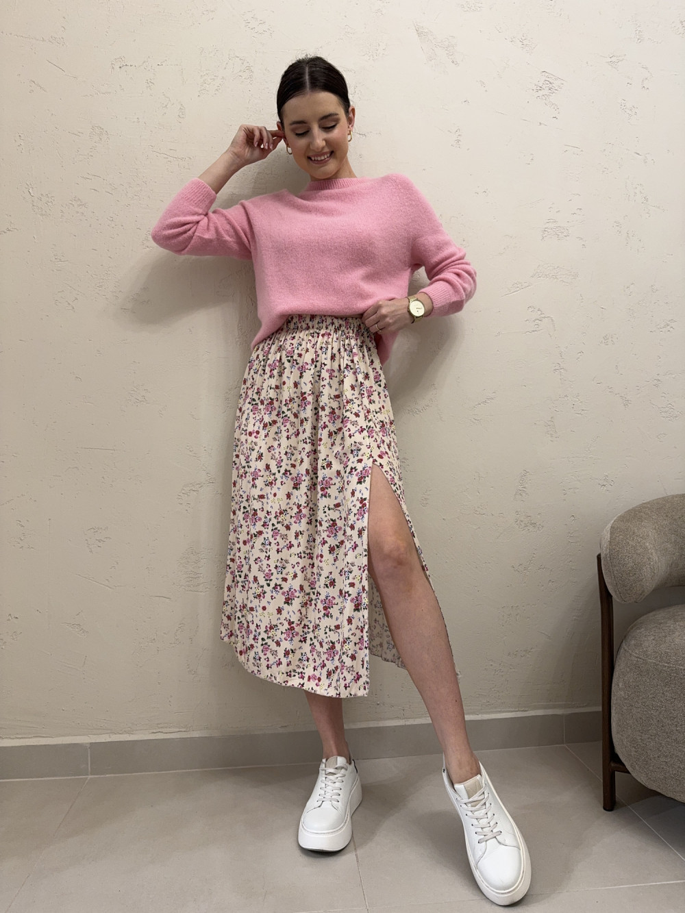 Zwiewna spódnica w kwiaty, uszyta w 100% z wiskozy, która pięknie pracuje w ruchu i nadaje stylizacji lekkości. W talii wszyta gumka zapewnia wygodę i dobre dopasowanie, a subtelne rozcięcie dodaje kobiecego charakteru i wysmukla sylwetkę.