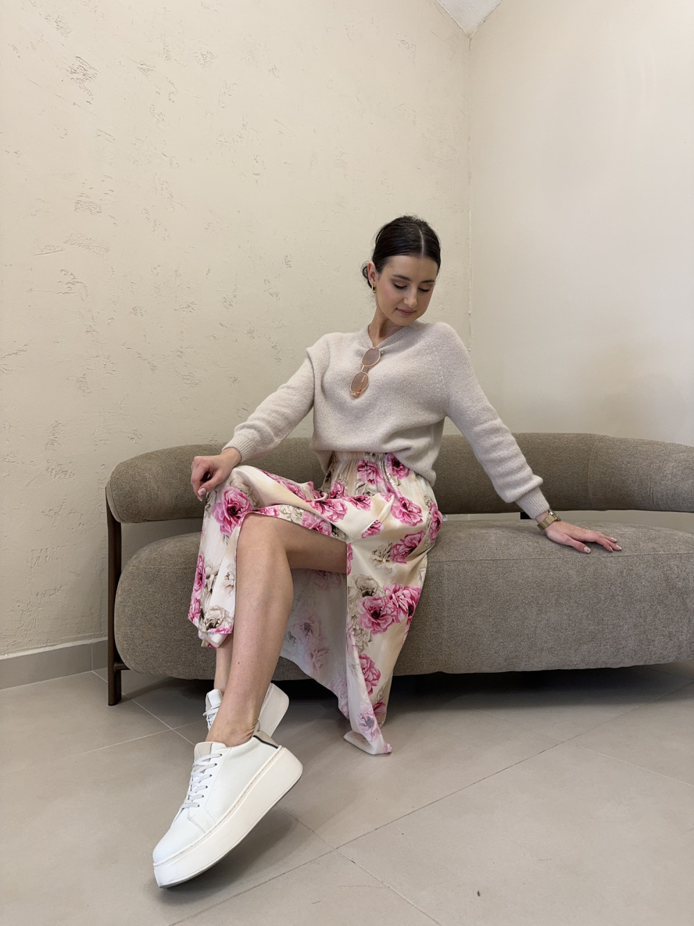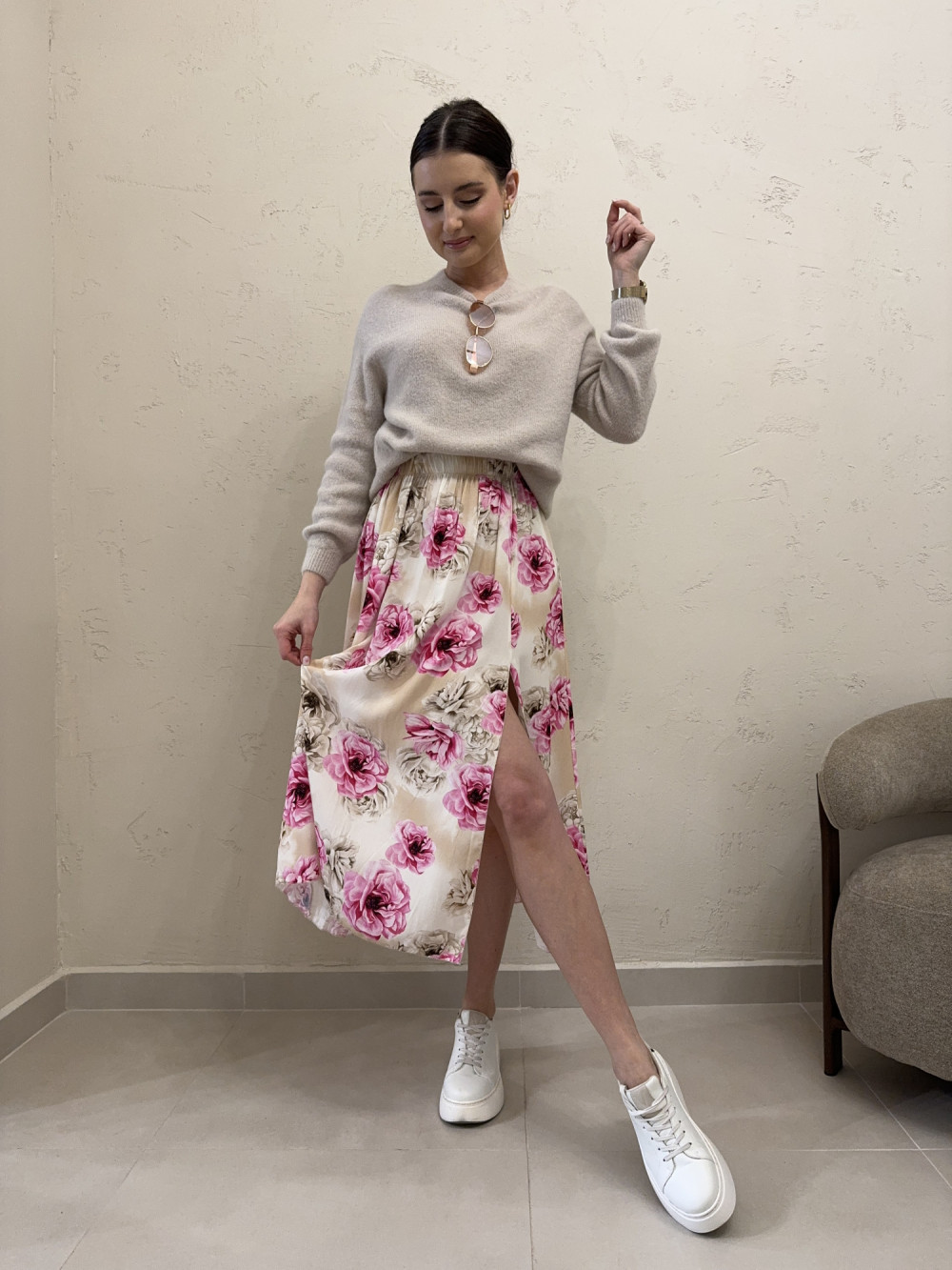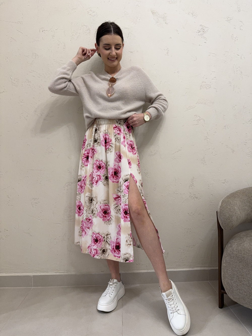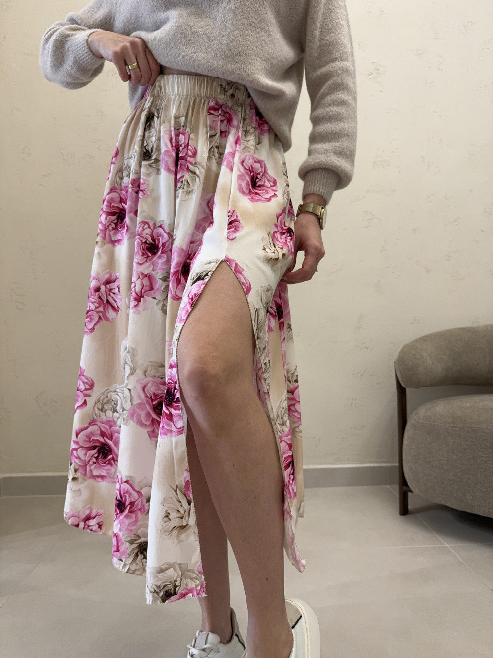 Spódnica z rozcięciem 100% wiskoza duże pastelowe kwiaty MARTHA