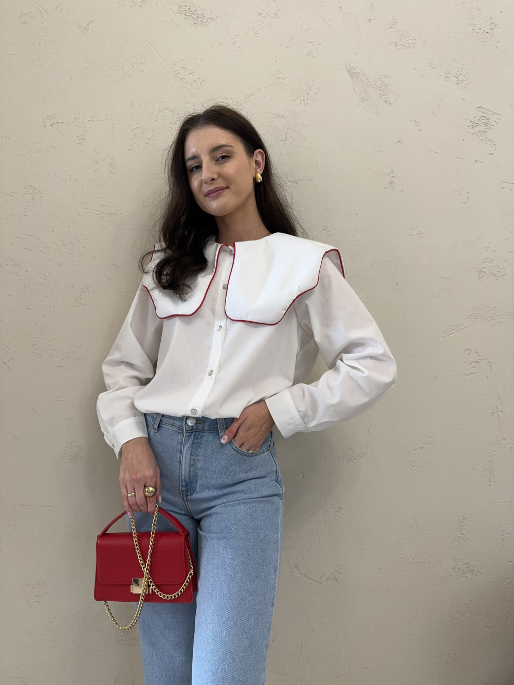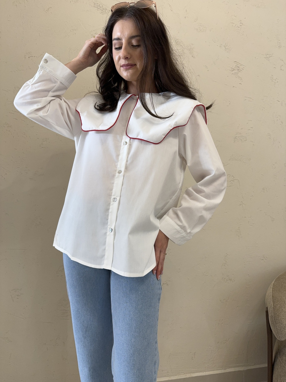 Koszula z dużym kołnierzem z czerwoną lamówką 100% bawełna COLETTE