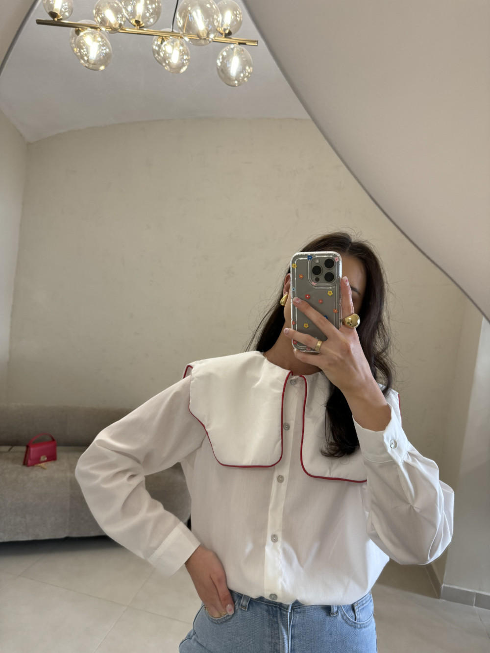 Koszula z dużym, efektownym kołnierzem obszytym kontrastową, czerwoną lamówką, która pięknie podkreśla linię ramion. Wykonana z bawełny, lekka i przyjemna dla skóry. Luźniejszy krój zapewnia swobodę, a delikatne rozcięcia po bokach u dołu sprawiają, że koszula ładnie układa się zarówno wpuszczona w spodnie, jak i noszona na zewnątrz. Guziki w kolorze tkaniny subtelnie dopełniają całość, pozostawiając uwagę na dopracowanym detalu kołnierza.