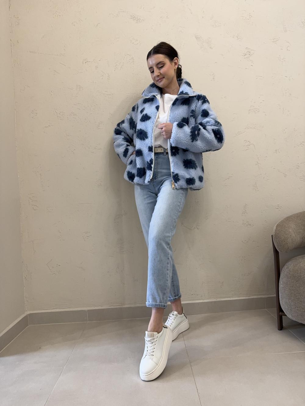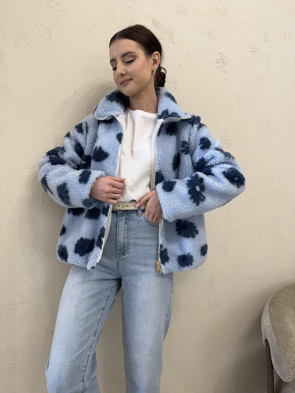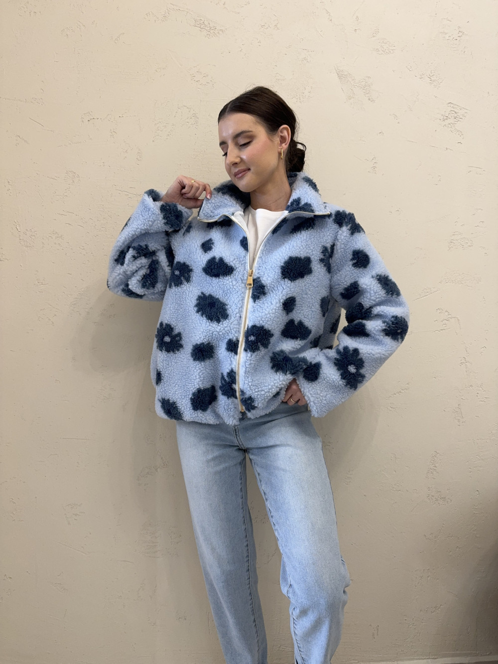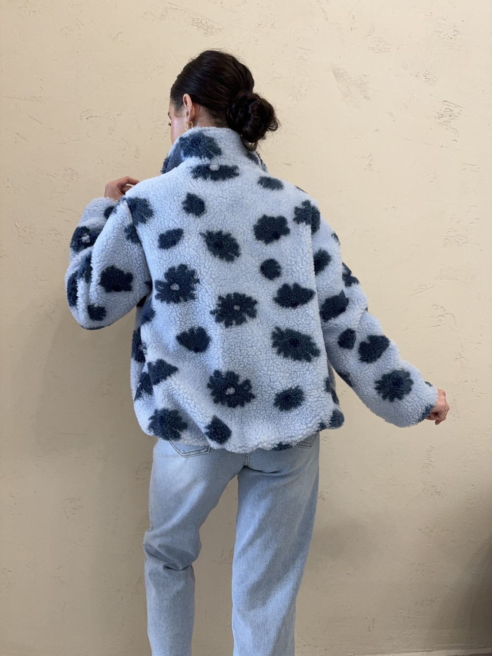 Polar/kurtka typu baranek w kwiaty niebieska FLUFFY