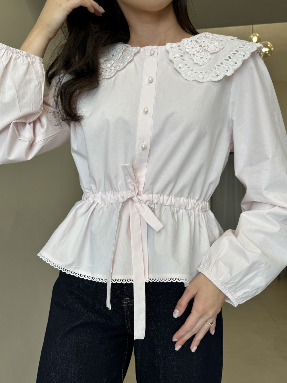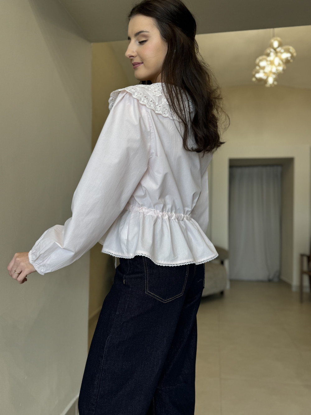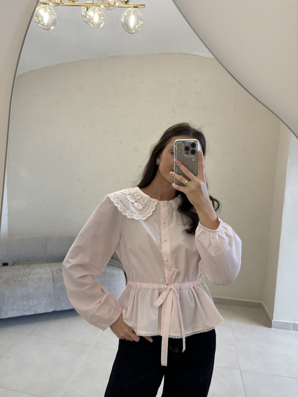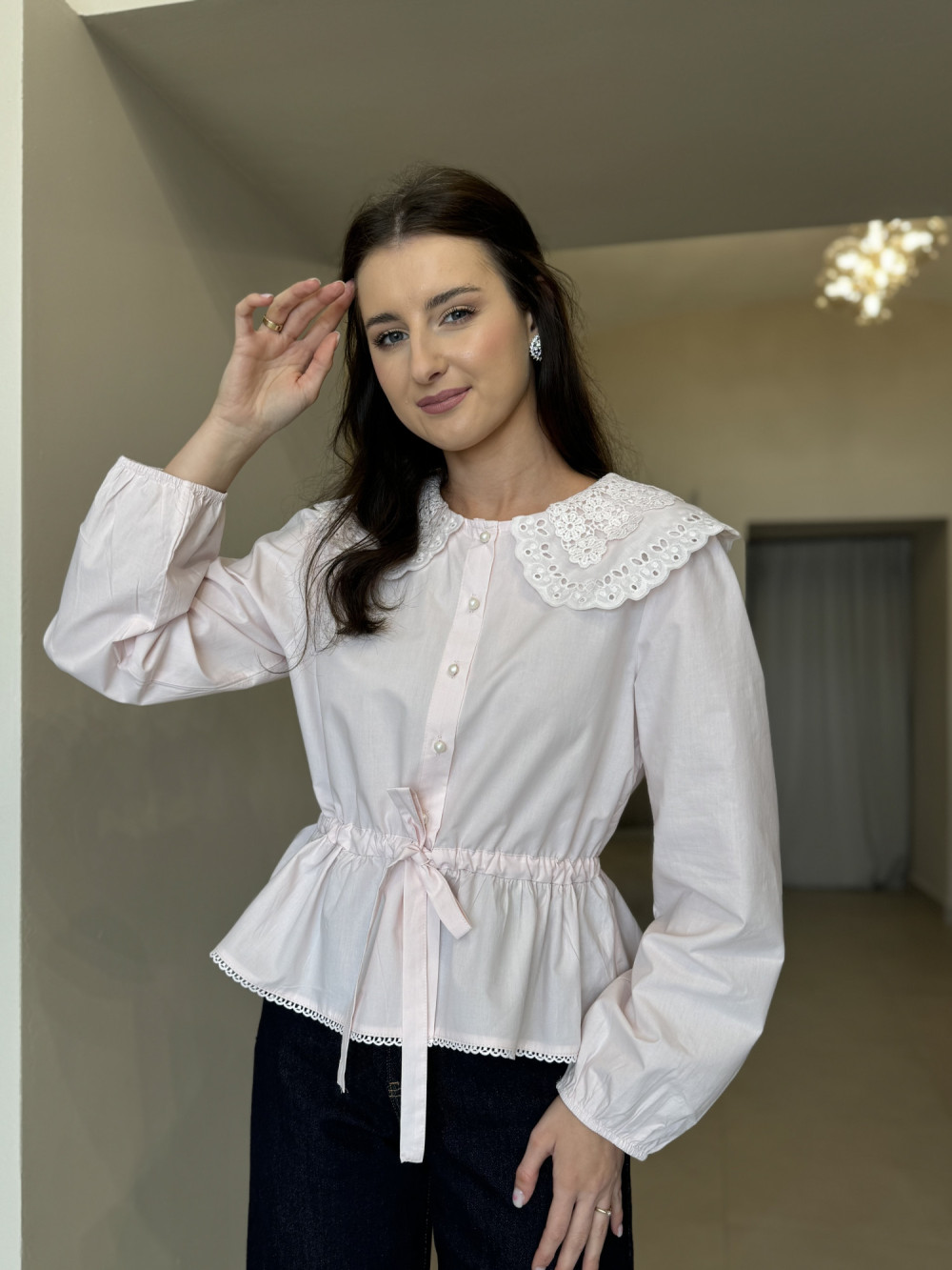 Bluzka jasnoróżowa z baskinką i ozdobym kołnierzem MEGI