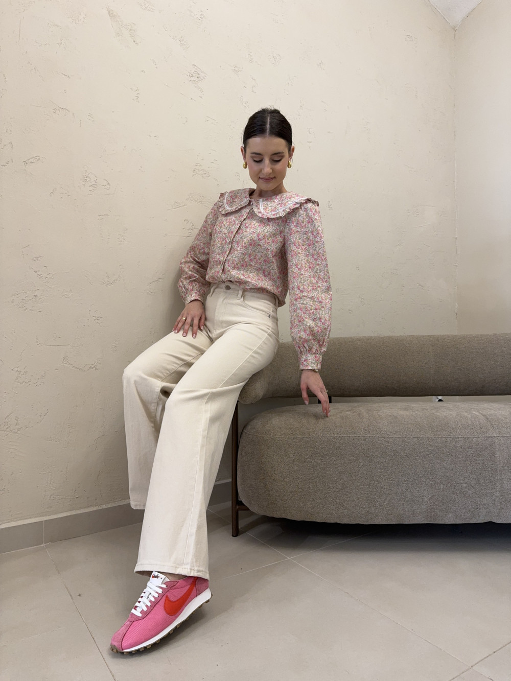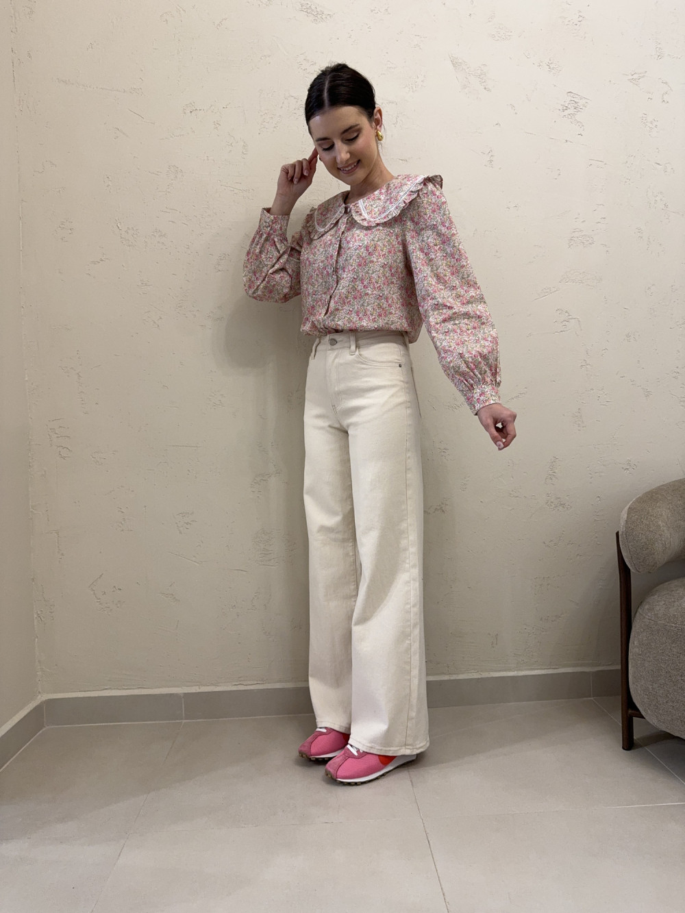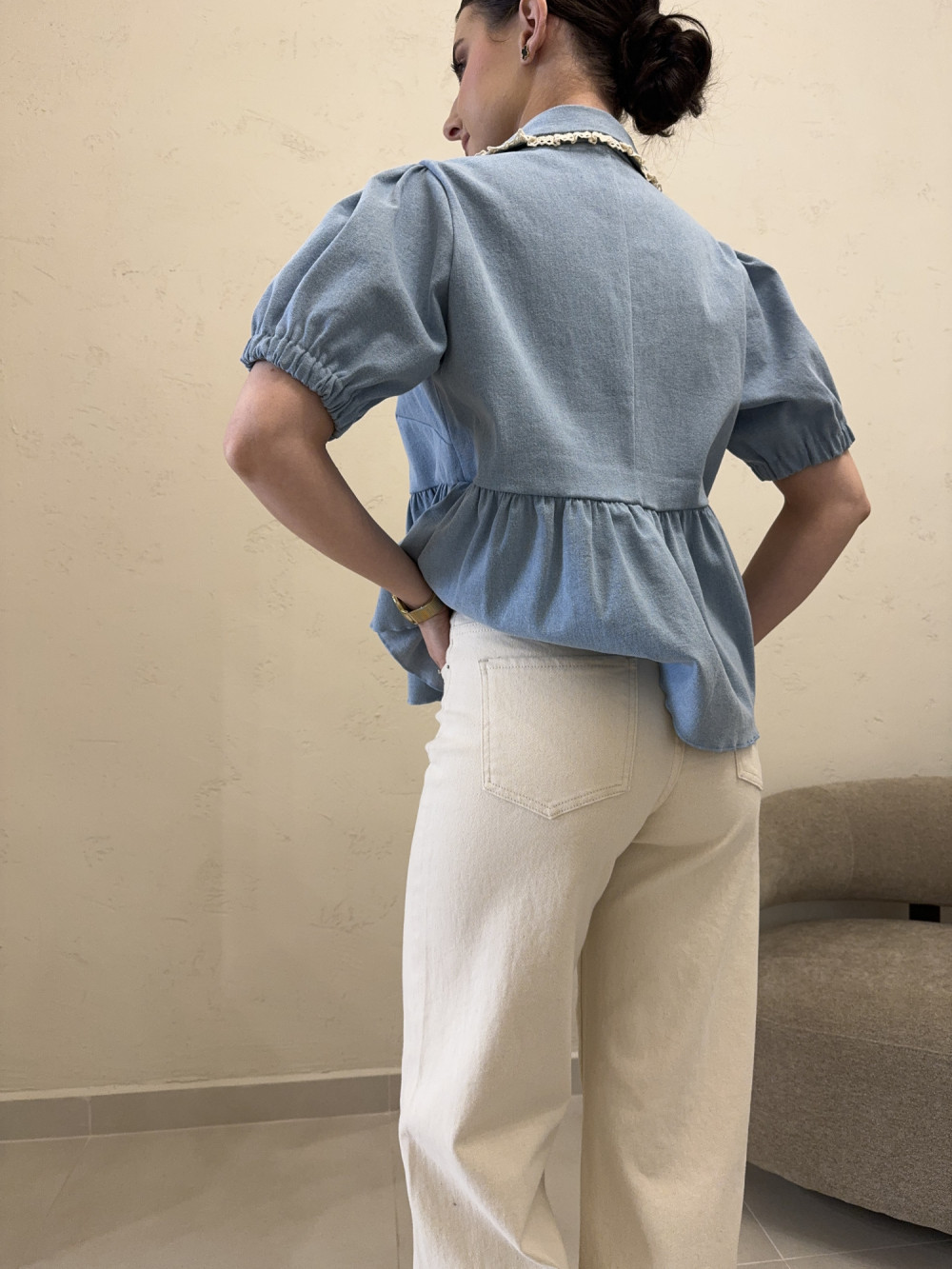 Spodnie z miękkiego denimu o wysokim stanie i szerokich nogawkach, które wydłużają optycznie sylwetkę. Tkanina jest przyjemna, elastyczna i komfortowa w noszeniu, dzięki czemu spodnie pięknie dopasowują się w talii, zachowując swobodę w biodrach i nogawkach. Klasyczny fason w nowoczesnym wydaniu – idealny do koszuli, swetra czy dopasowanego topu.