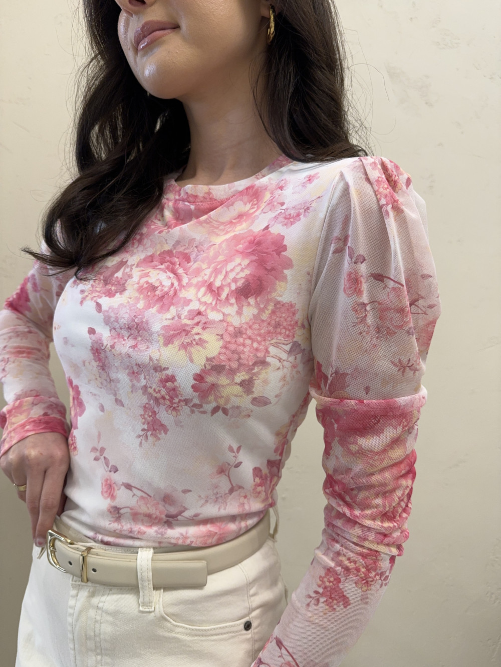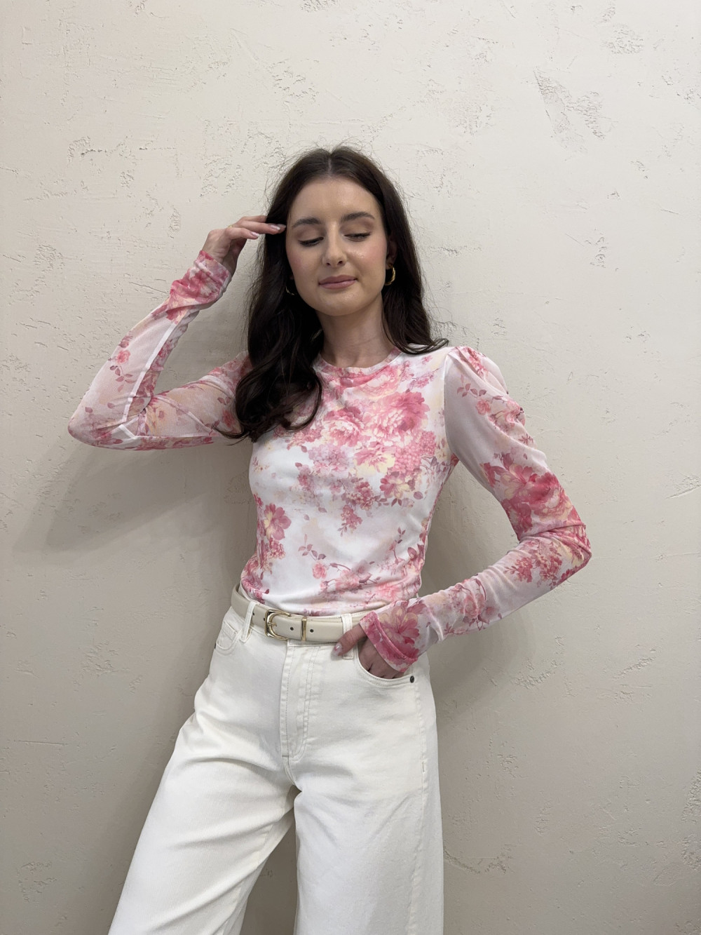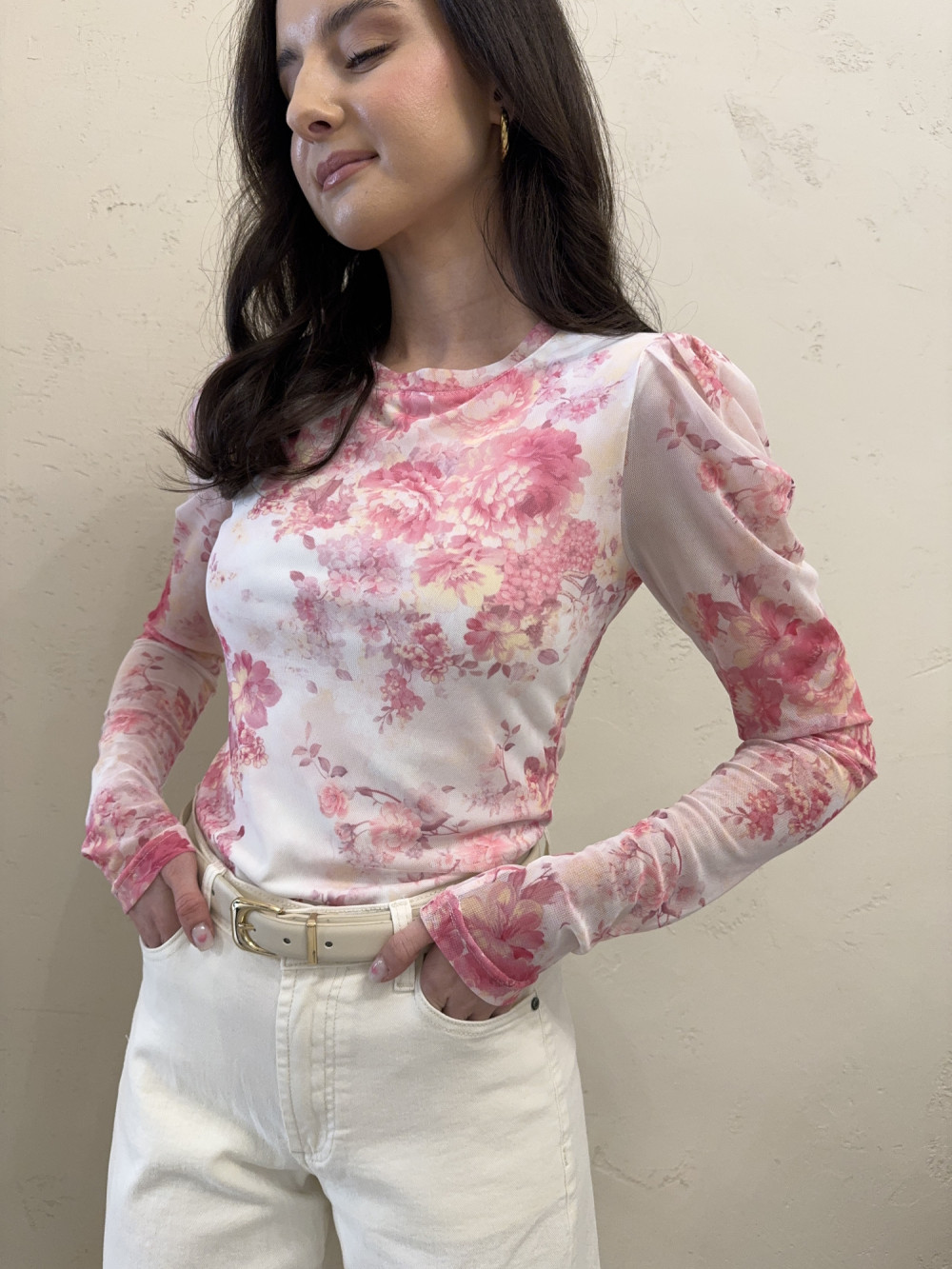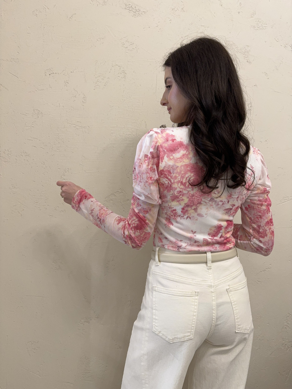 Elegancka bluzka z siateczki, wykończona podszewką, co sprawia, że jest wygodna i praktyczna. Bufki na ramionach dodają jej szyku, a kwiatowy print przyciąga wzrok i wpisuje się w najnowsze trendy. To model, który doskonale komponuje się zarówno ze spódnicami, jak i klasycznymi jeansami.