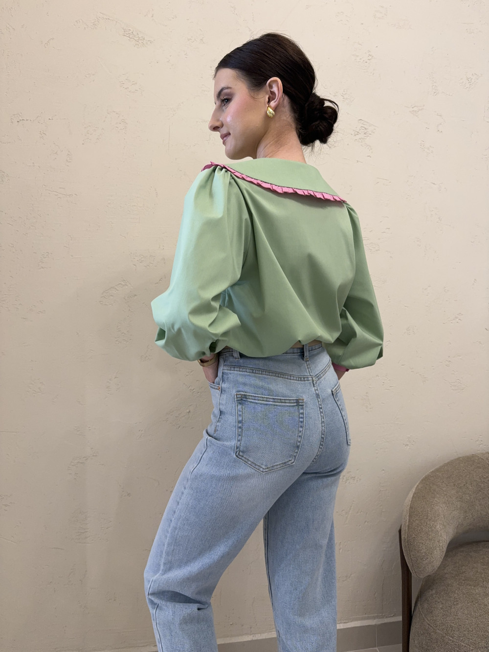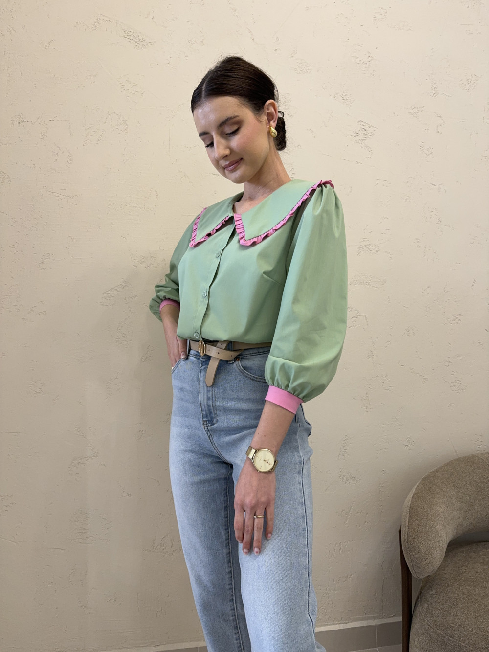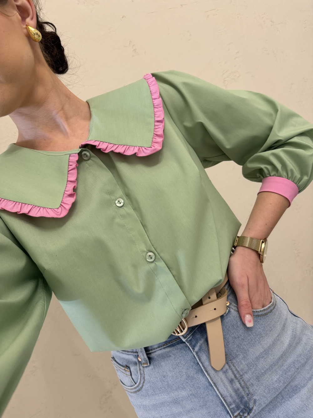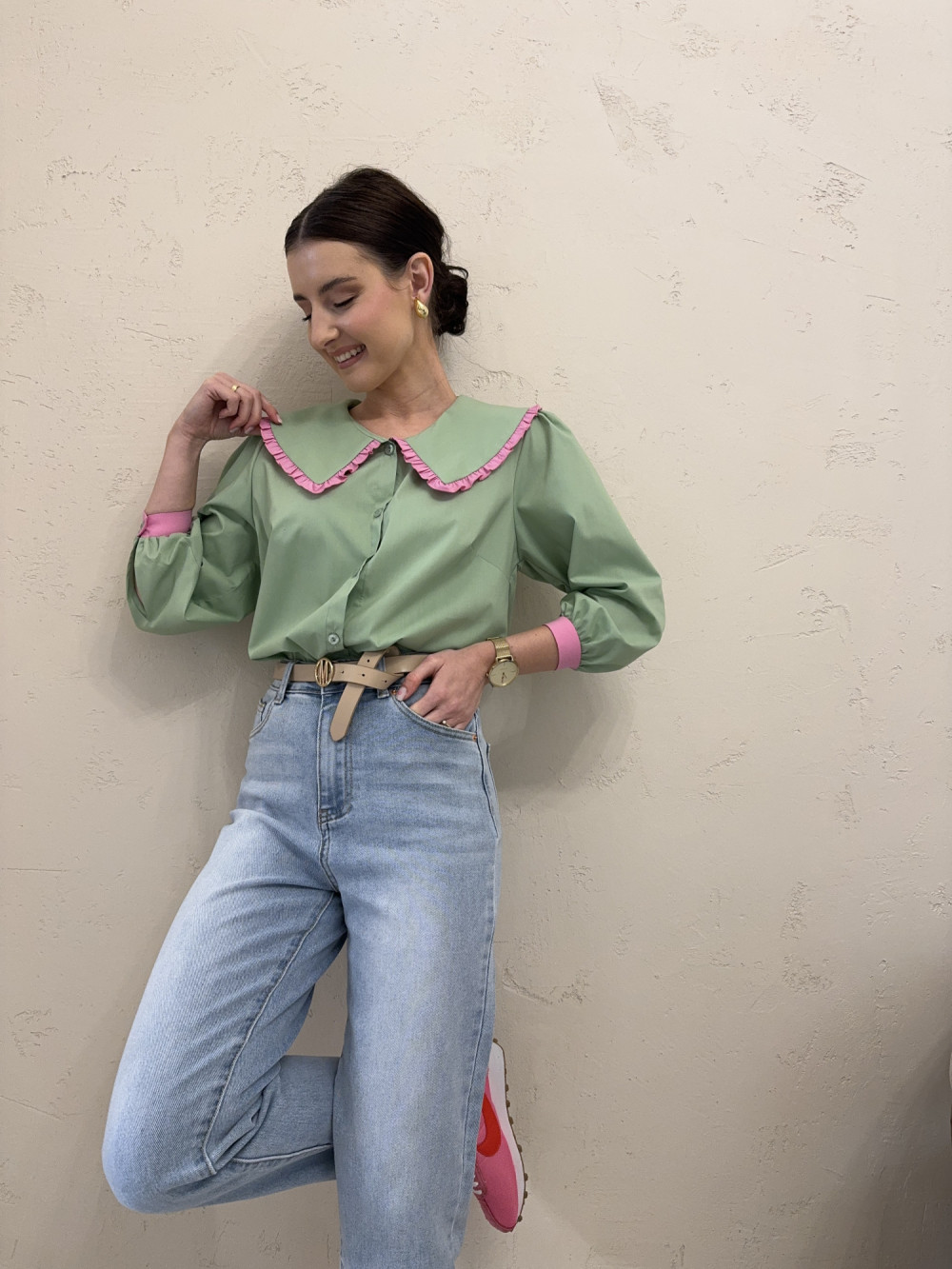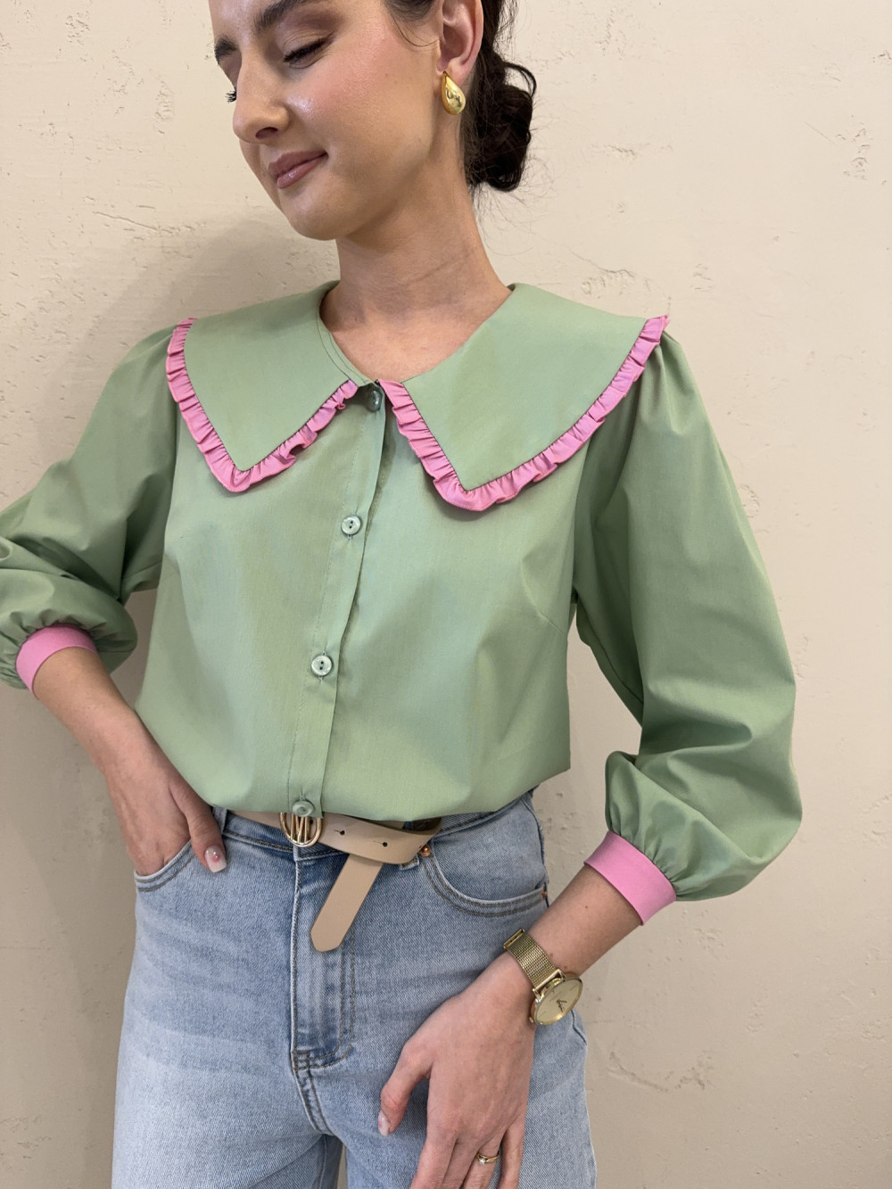 Koszula z kołnierzem z różową lamówką zielona HENIA