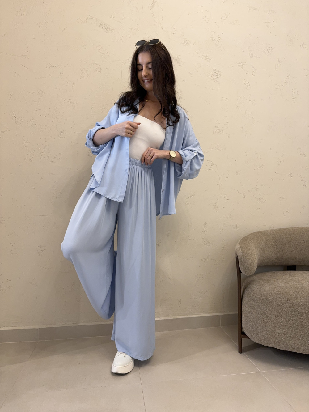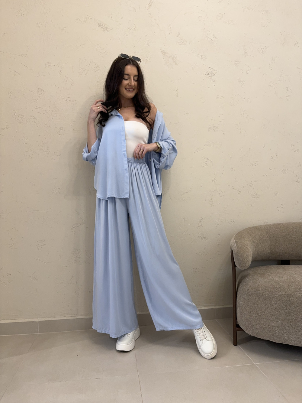 Komplet szerokie spodnie + koszula oversize baby blue VIRAL