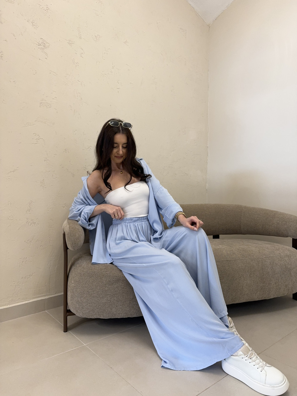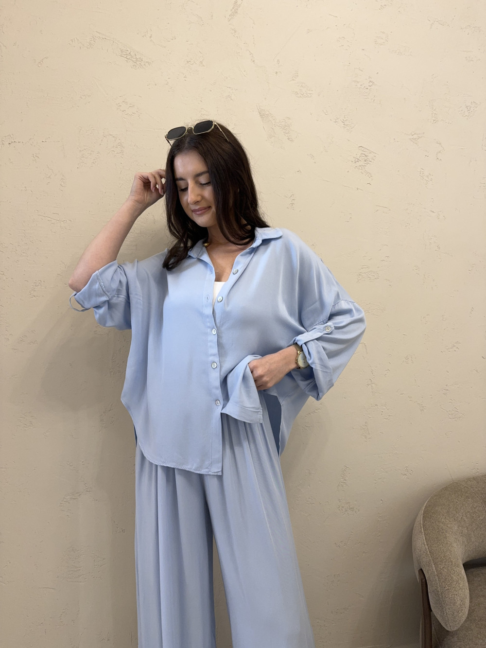 Komplet składający się z szerokich spodni z gumką w pasie oraz oversizowej koszuli zapinanej na guziki. Tkanina to połączenie 50% wiskozy i 50% lyocellu (tencelu), dzięki czemu materiał jest miękki, przewiewny i pięknie pracuje w ruchu. Spodnie swobodnie opływają sylwetkę, a luźna koszula pozwala nosić zestaw zarówno razem, jak i osobno. Idealna baza do stylizacji codziennych i bardziej dopracowanych.