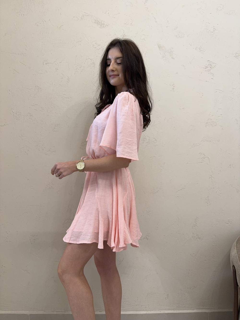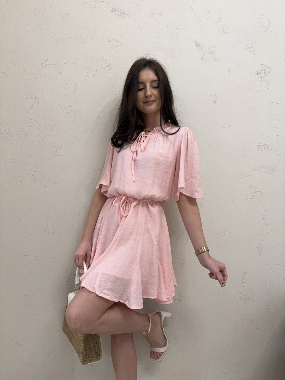 Lekka, kobieca propozycja idealna na ciepłe dni. Uszyta w większości z przyjemnej wiskozy, posiada podszewkę, dzięki czemu pięknie układa się na sylwetce. Luźny fason zapewnia swobodę i komfort noszenia. Dołączony sznurek pozwala w prosty sposób podkreślić talię i dopasować sukienkę do swojej figury. Delikatny różowy kolor dodaje stylizacji świeżości i romantycznego charakteru.