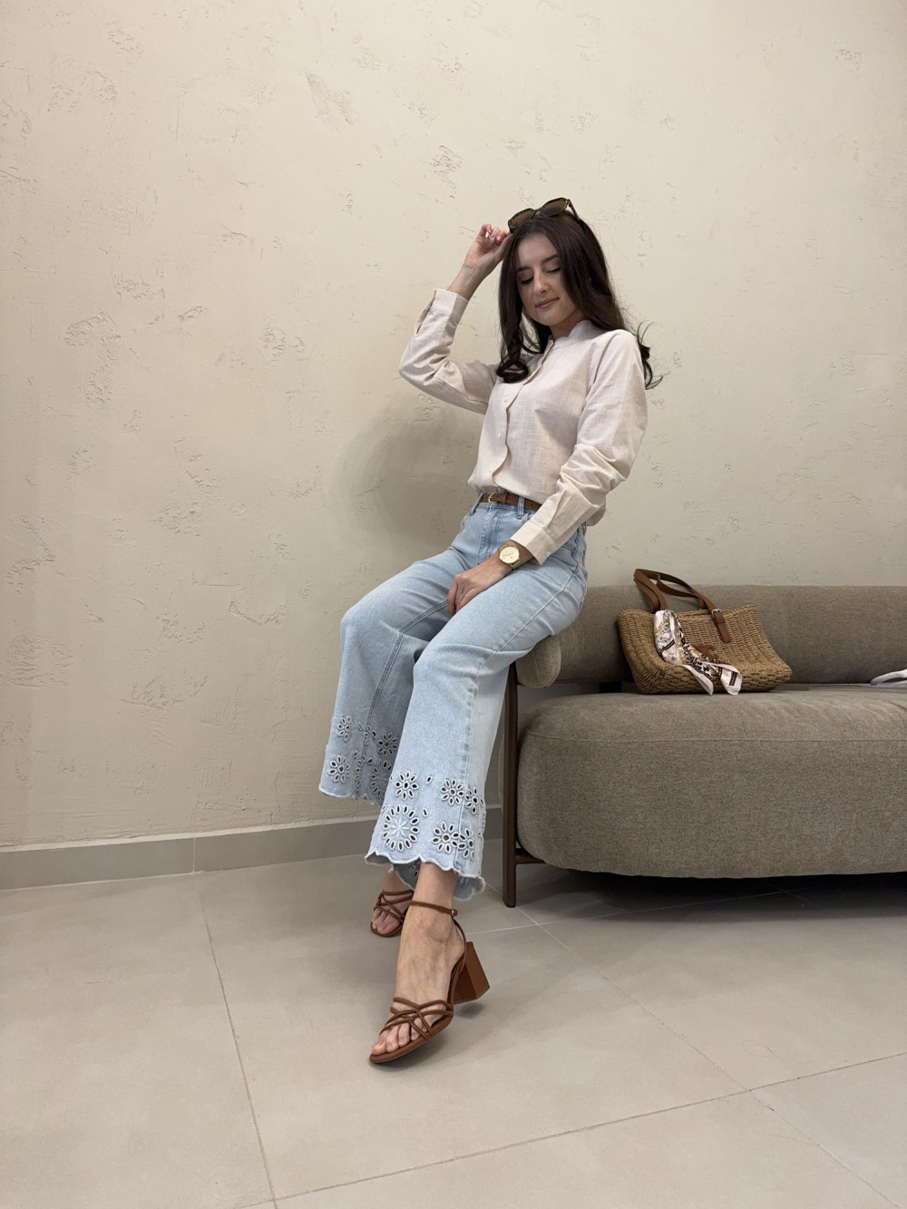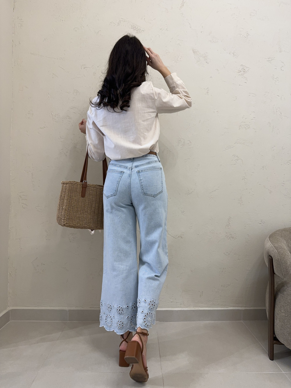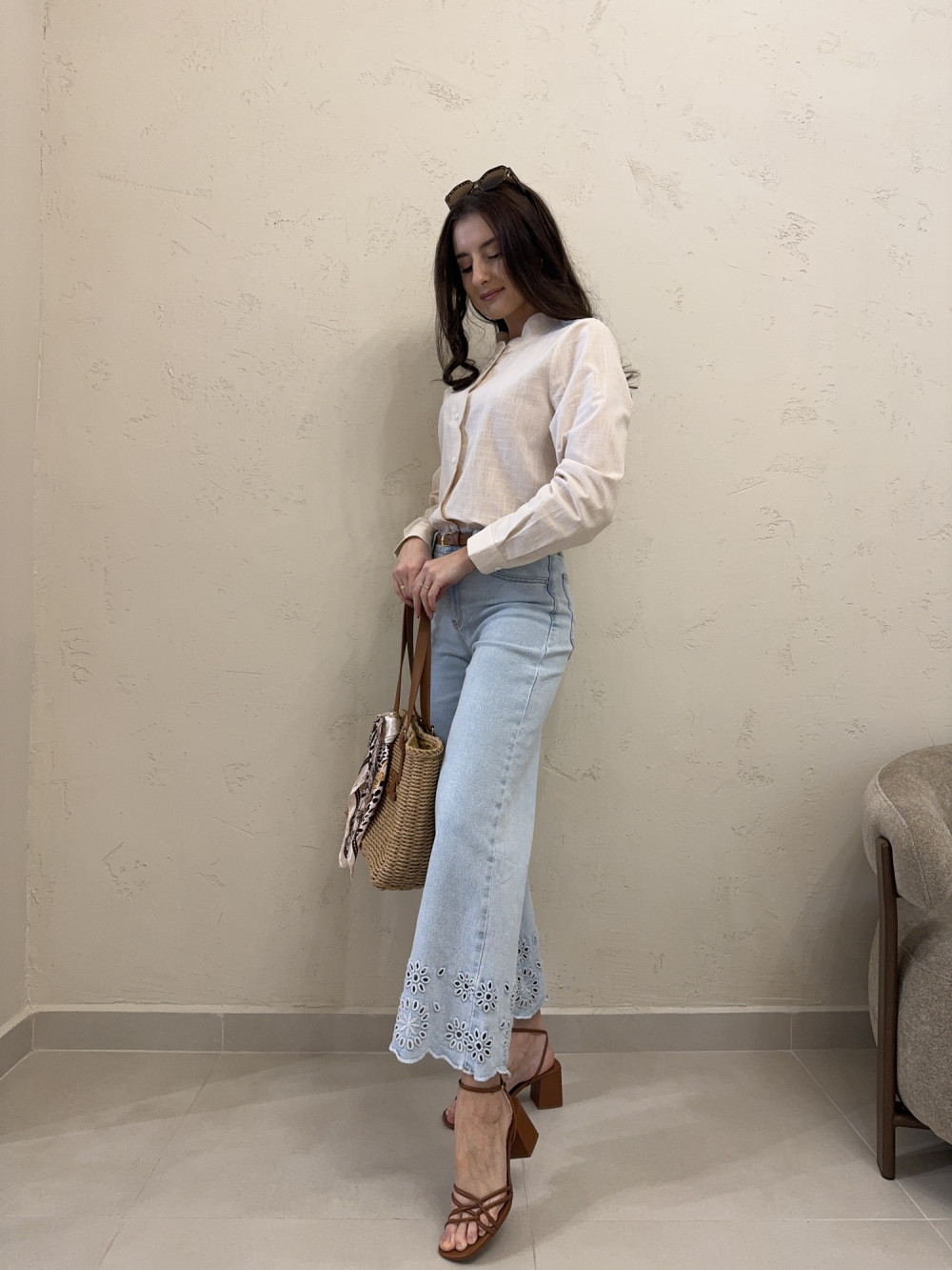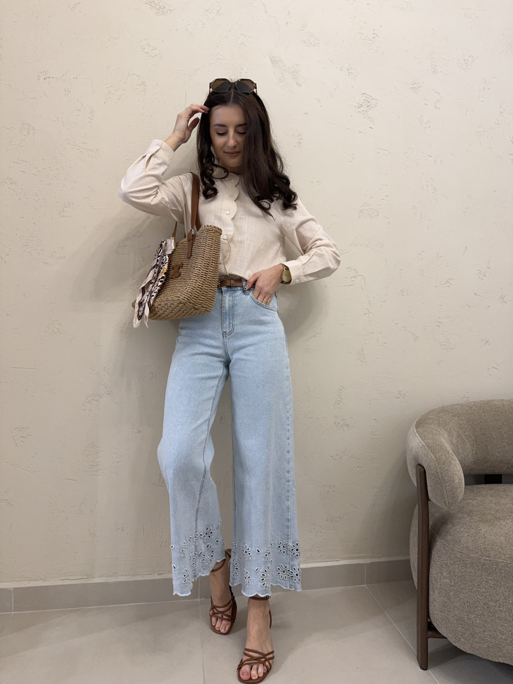 Spodnie MIRO to model z wysokim stanem, który doskonale podkreśla talię. Wykonane z miękkiego, przyjemnego w dotyku denimu z przewagą bawełny, zapewniają komfort noszenia przez cały dzień. Nogawki wykończone delikatnym ażurowym haftem dodają im lekkości i oryginalności. Jasny kolor pięknie rozjaśnia stylizacje. To idealny wybór na wiosnę i lato.