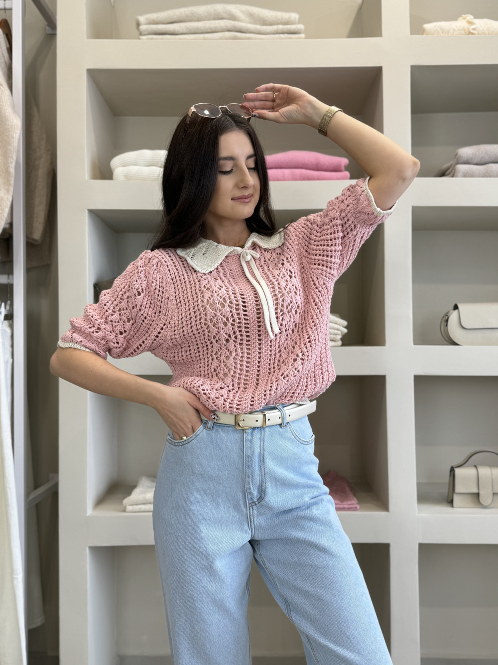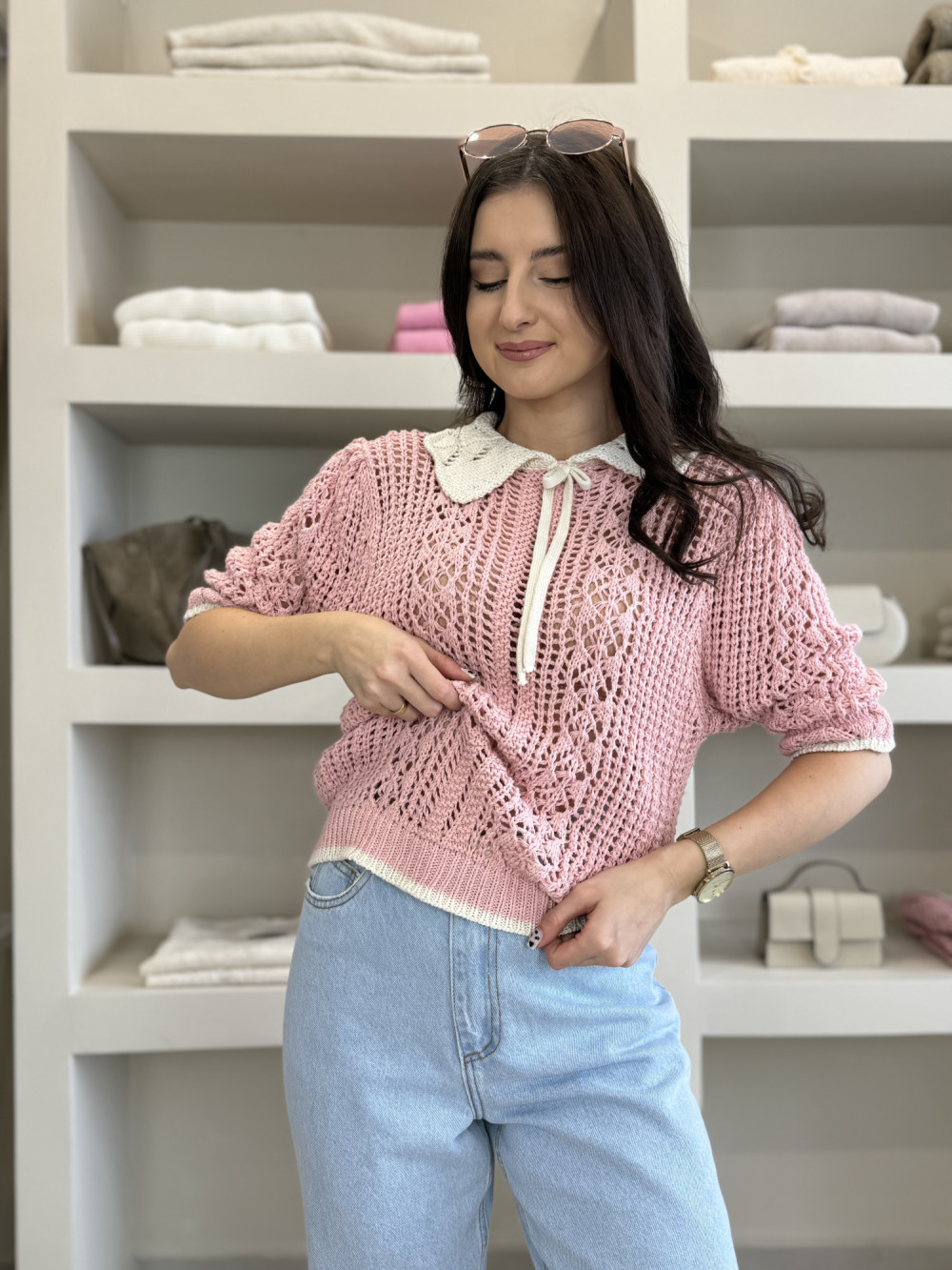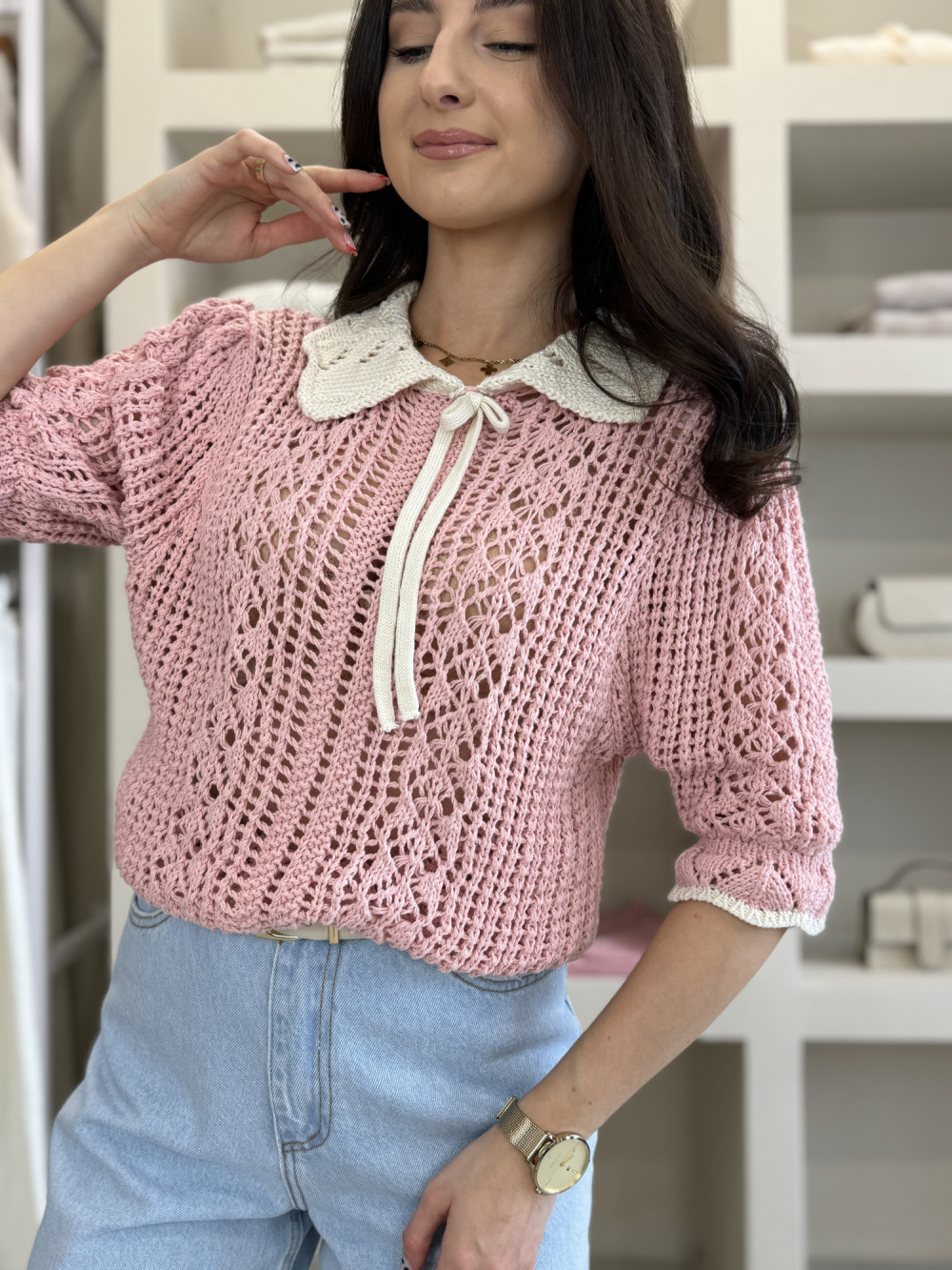 Bluzka polo ażurowa z kołnierzykiem różowa VIA